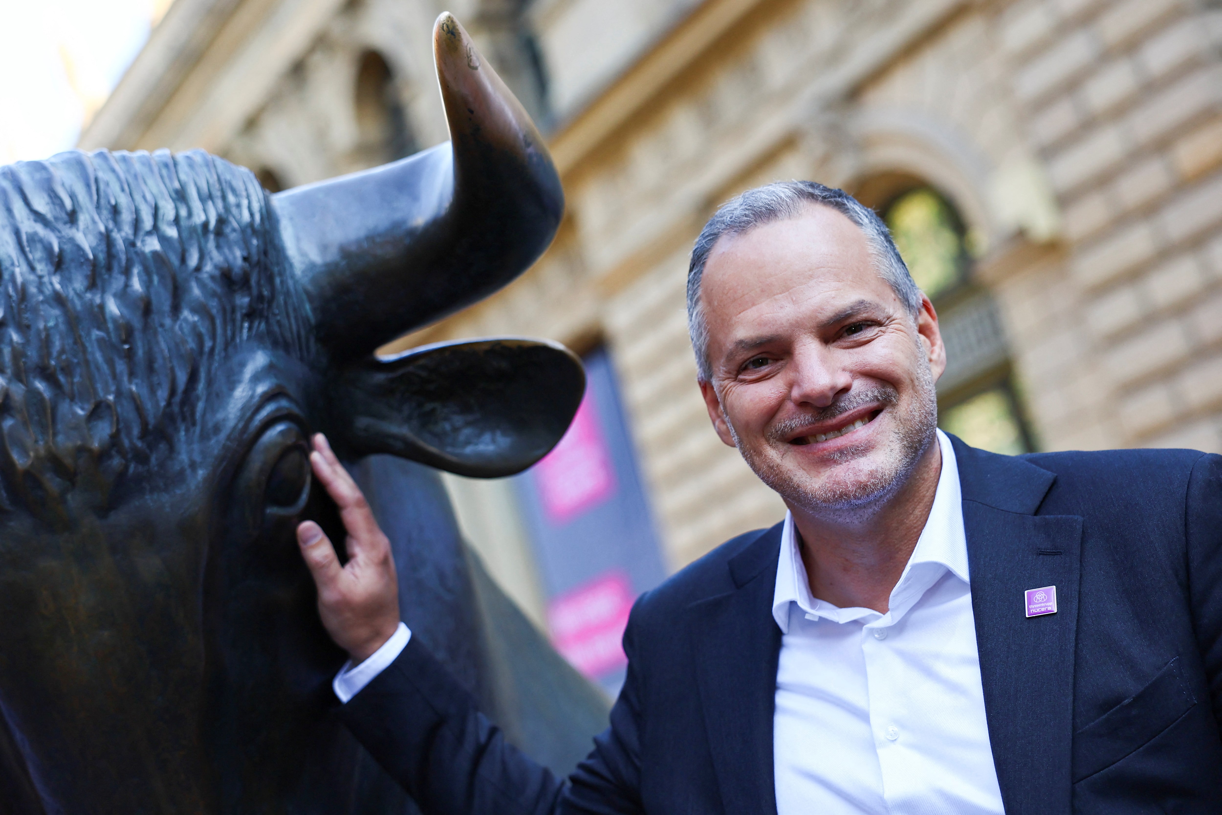 2023年7月7日,蒂森克虜伯Nucera公司首席執行官維爾納·波尼克瓦爾在德國法蘭克福證券交易所外與公牛雕塑合影,該公司即將進行首次公開募股。路透社/凱·普法芬巴赫/資料圖片購買授權許可,打開新標籤頁8月13日(路透社) - 蒂森克虜伯Nucera (NCH2.DE),打開新標籤頁首席執行官週三表示,公司正與美國項目的利益相關方進行深入討論,並放棄那些因美國總統唐納德·特朗普的税收和支出政策變化而不再視為可行的項目。全球對綠色氫能的需求因清潔技術行業對特朗普政策影響的擔憂而停滯不前。