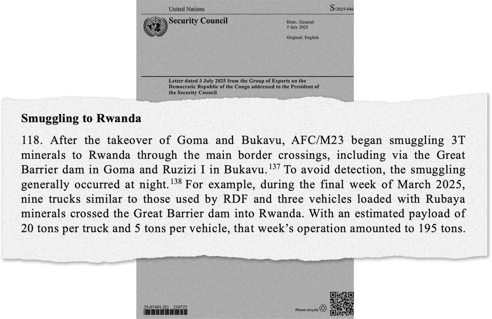 根據聯合國7月報告,自M23叛亂分子控制剛果(金)兩座邊境城市後,大量剛果礦產通過卡車走私進入盧旺達。聯合國 via 路透社路透社記者今年3月探訪魯巴亞時,M23官員透露叛軍對礦產貿易商徵收15%税費,針對其從當地非正規礦工處購買的鉭鐵礦價值。據聯合國12月報告,M23每月從剛果東部鉭鐵礦開採徵税中獲利80萬美元。