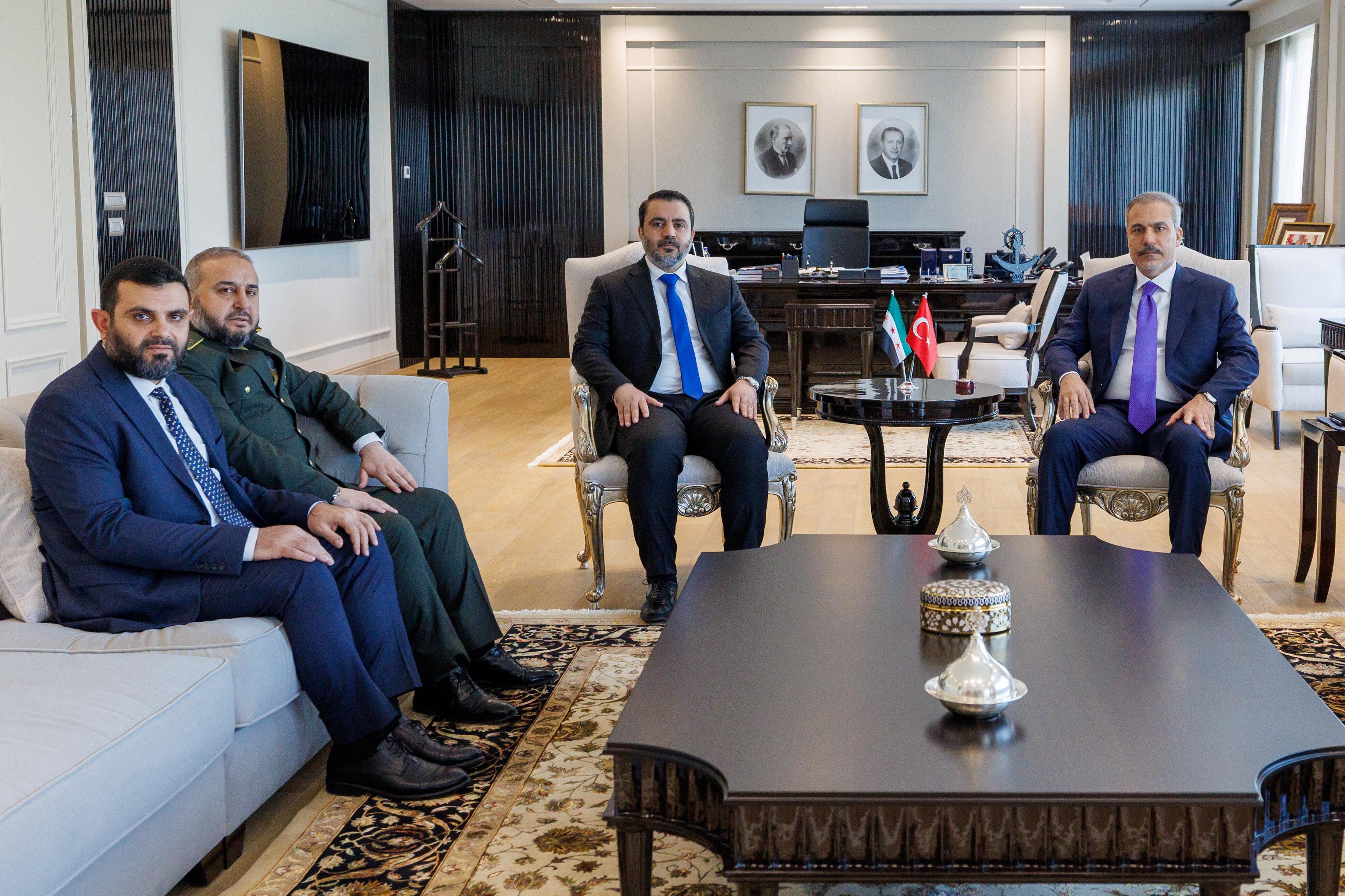 敍利亞外長阿薩德·謝巴尼在情報總局局長侯賽因·薩拉馬及國防部長馬爾哈夫·阿布·庫斯拉陪同下,於2025年8月13日在安卡拉會晤土耳其外長哈坎·菲丹。土耳其外交部提供的照片由路透社通過第三方獲取(禁止轉售圖片或存檔)購買授權許可,打開新標籤頁安卡拉8月14日(路透社)——土耳其國防部消息人士週四表示,根據週三簽署的軍事合作協議,該國將向敍利亞提供武器系統和後勤物資,並補充稱安卡拉還將在必要時為敍利亞軍隊提供裝備使用培訓。