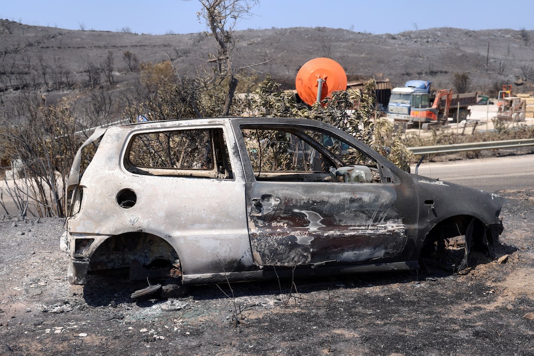 2025年8月14日,希臘希俄斯島沃利索斯,野火過後,一輛損毀的汽車停在路邊。路透社/Konstantinos Anagnostou 購買授權 許可,打開新標籤頁路透社希臘帕特雷/馬德里8月14日電 - 週四,數百名消防員在南歐各地奮力撲滅野火,其中一些火災被認為是由縱火者故意引發,並因該地區的高温熱浪而加劇。