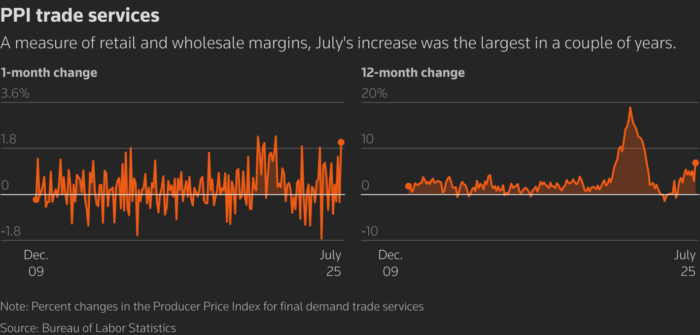 美國勞工部週四公佈的這份超預期的生產者通脹報告,緊隨本週數據顯示消費者上月為牙科護理和機票等服務支付了更高價格。8月初也未見勞動力市場進一步惡化的跡象。