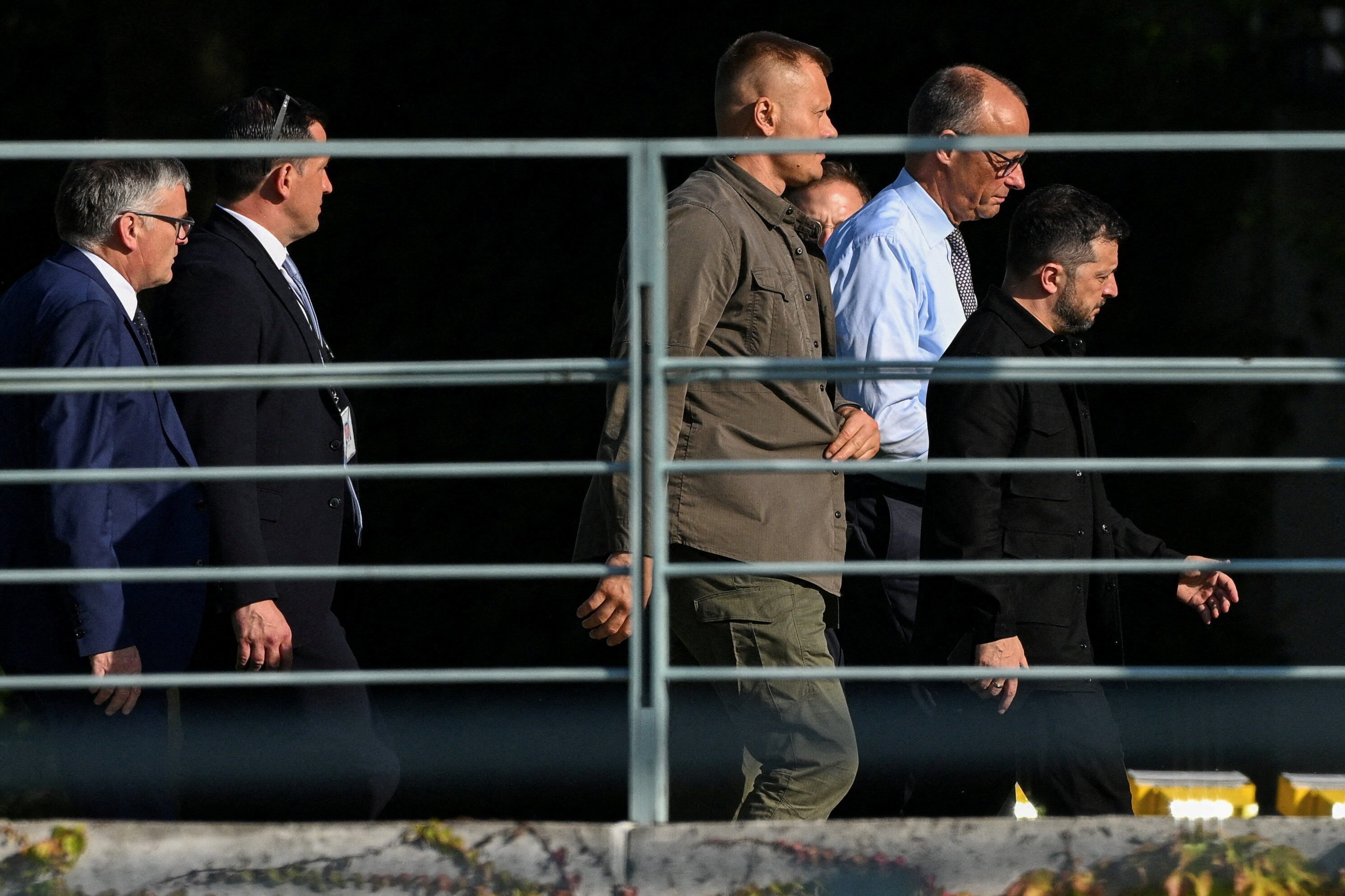 烏克蘭總統弗拉基米爾·澤連斯基與德國總理弗里德里希·梅爾茨走向柏林的一架直升機