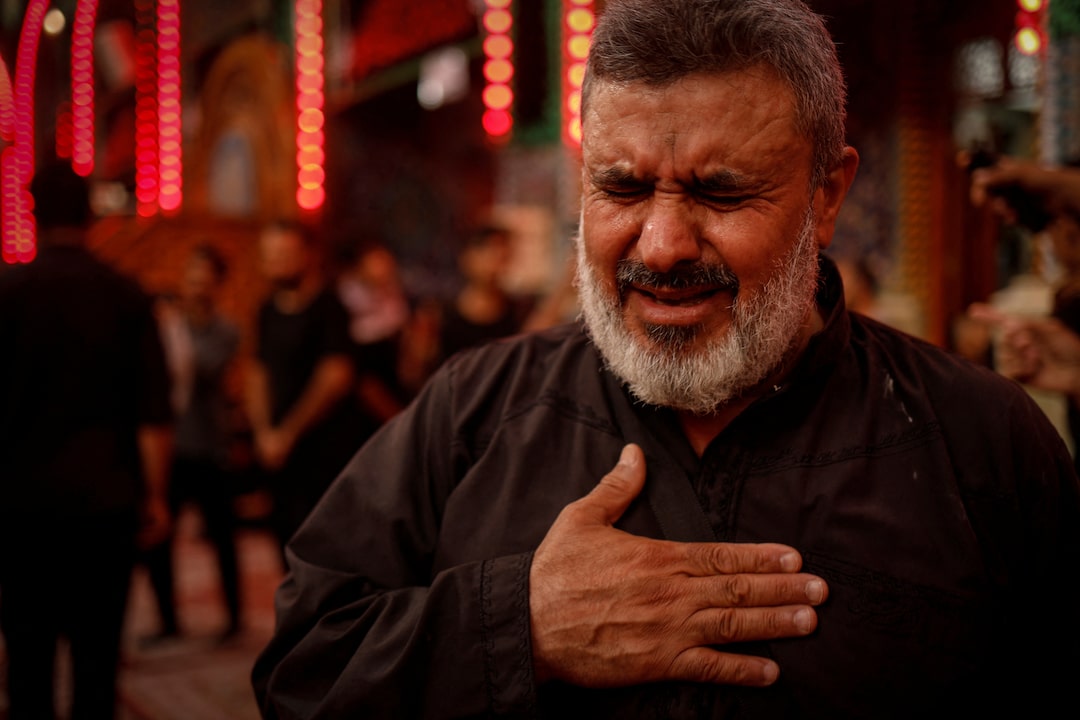 8項中的第1項:2025年8月11日,伊拉克聖城卡爾巴拉,58歲的馬吉德·卡里姆在伊瑪目侯賽因聖殿前對什葉派聖日阿舒拉節前的阿爾巴因儀式做出反應。路透社/Alaa al-Marjani