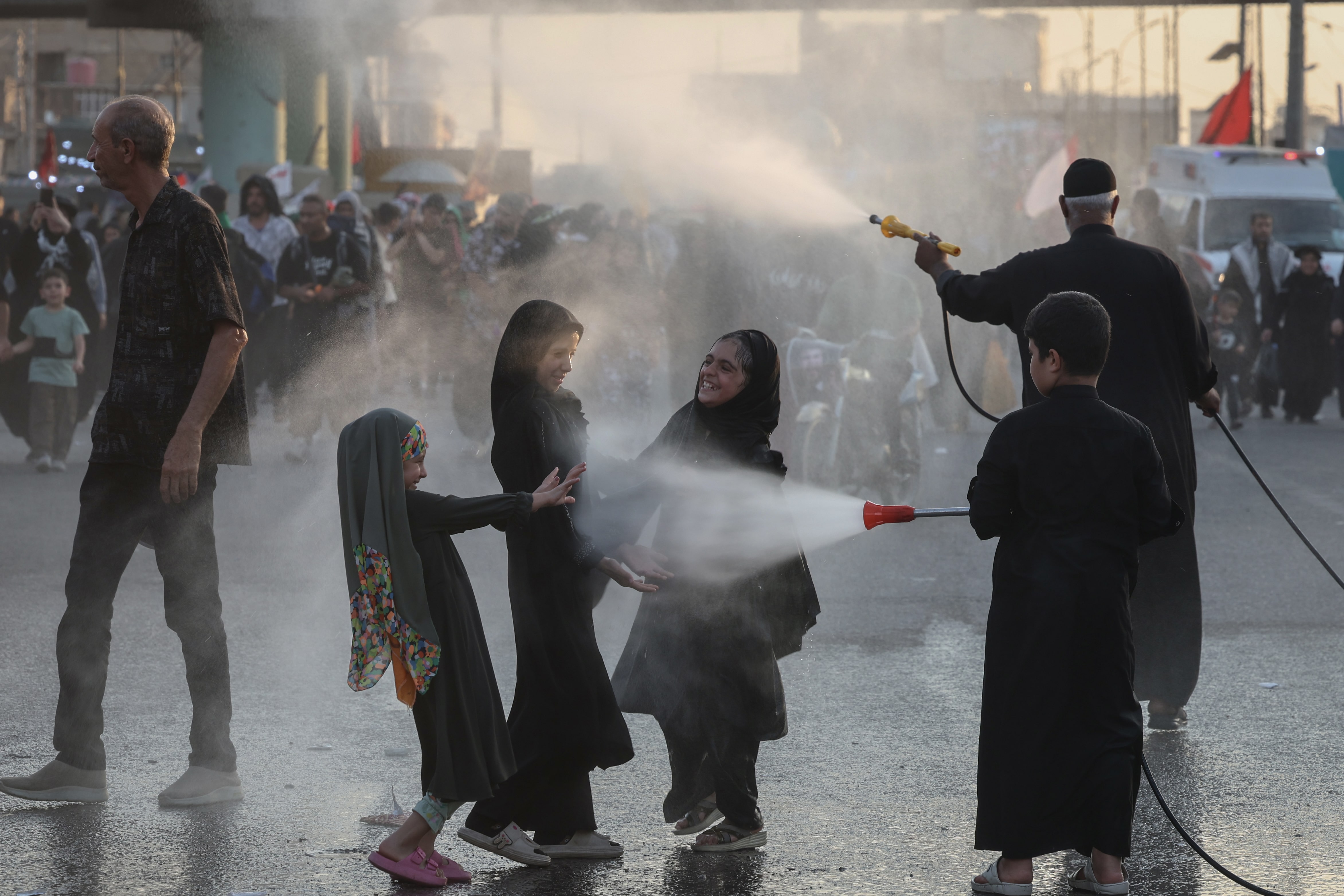 2025年8月8日,在納傑夫,什葉派穆斯林朝聖者徒步前往聖城卡爾巴拉時,女孩們被噴水降温,這是在阿爾巴因節聖儀前的場景。路透社/Alaa al-Marjani