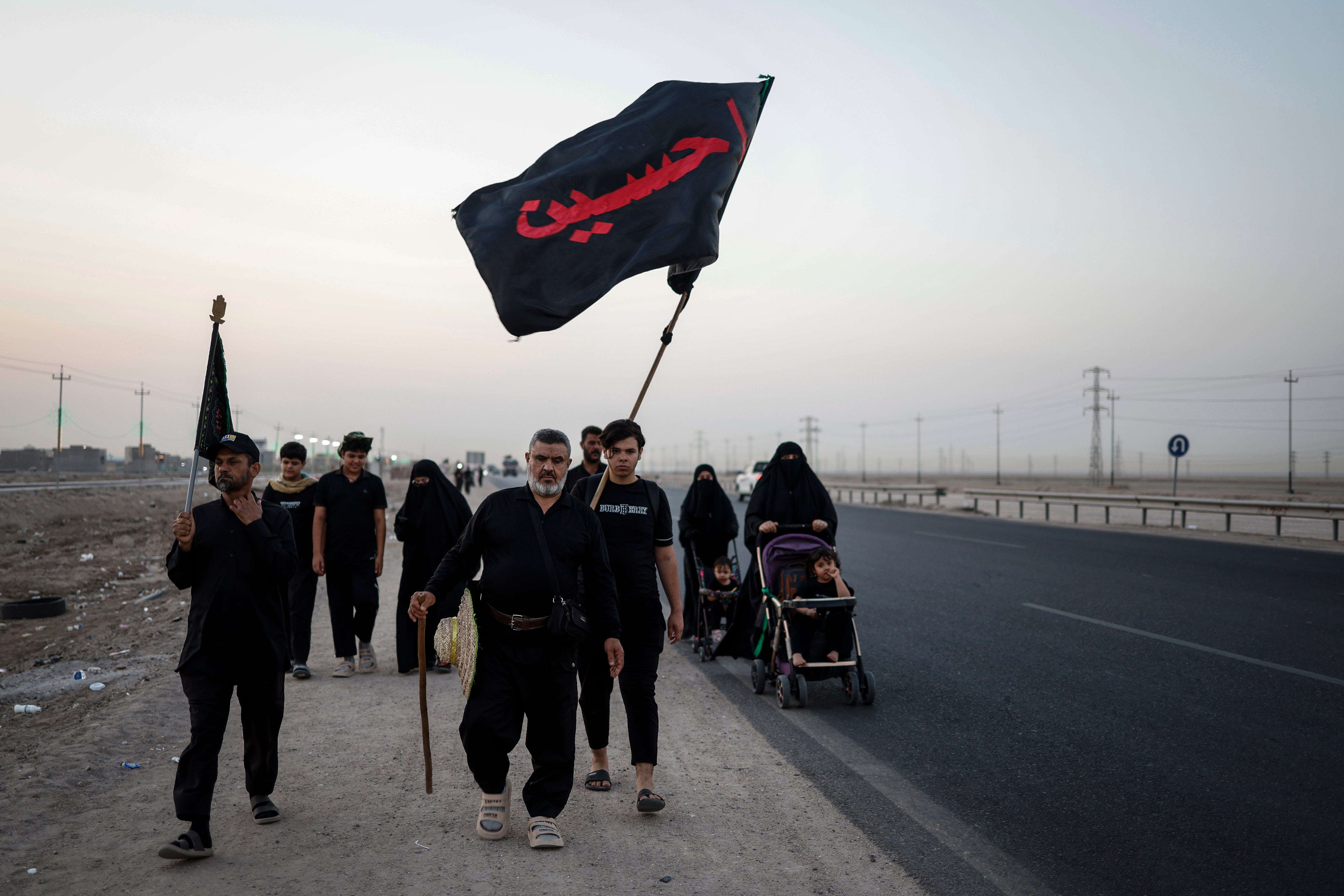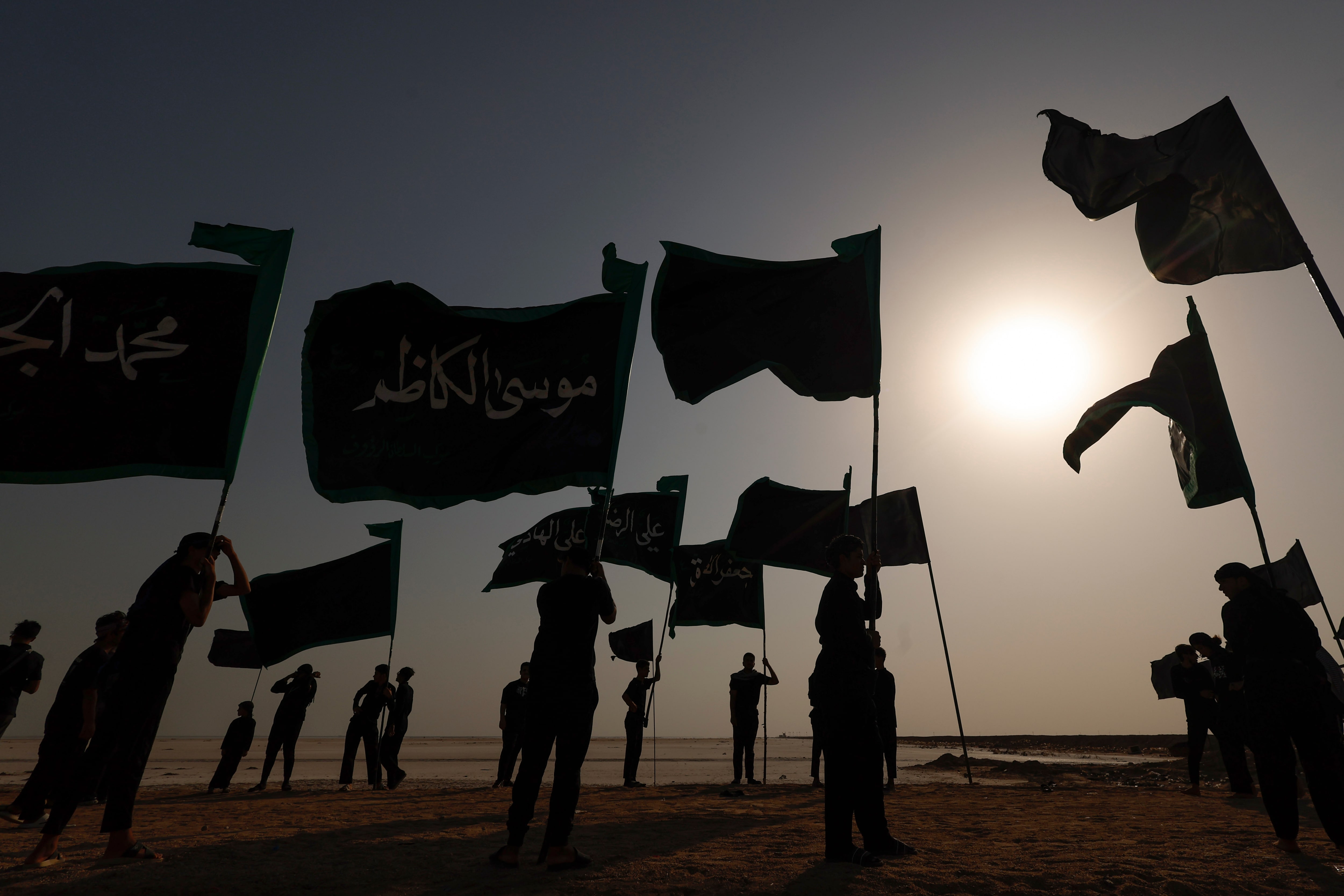 2025年7月20日,伊拉克巴士拉,什葉派穆斯林朝聖者從伊拉克最南端的Ras al-Bisha出發,手持旗幟開始前往聖城卡爾巴拉的朝聖之旅,正值阿爾巴因聖日前夕。路透社/Alaa al-Marjani