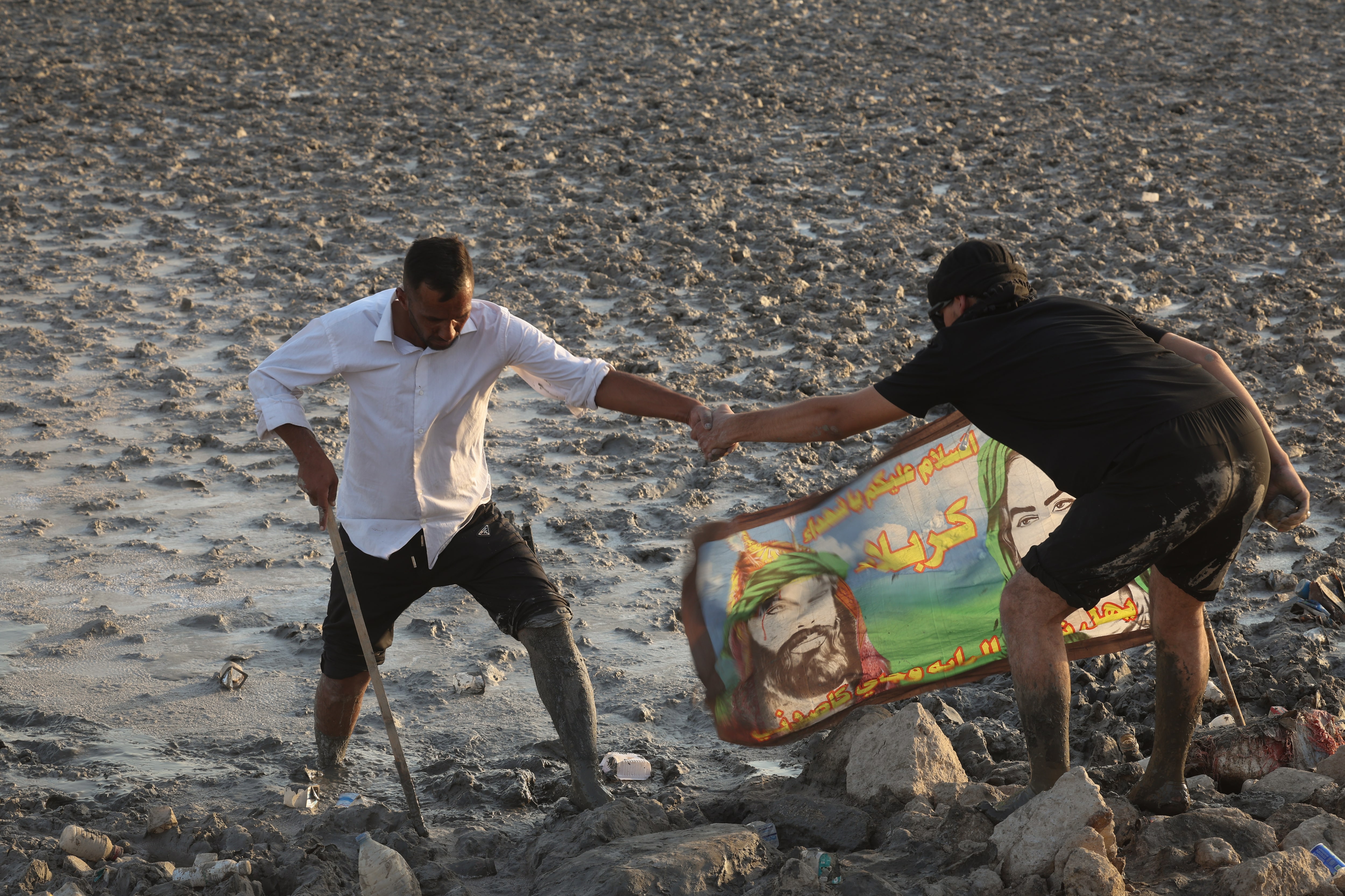 2025年7月20日,伊拉克巴士拉,一名什葉派穆斯林朝聖者在泥濘的海岸邊得到幫助,他們從伊拉克最南端的Ras al-Bisha地區出發,開始朝聖之旅,前往聖城卡爾巴拉,為即將到來的什葉派宗教儀式阿巴因做準備。路透社/Alaa al-Marjani