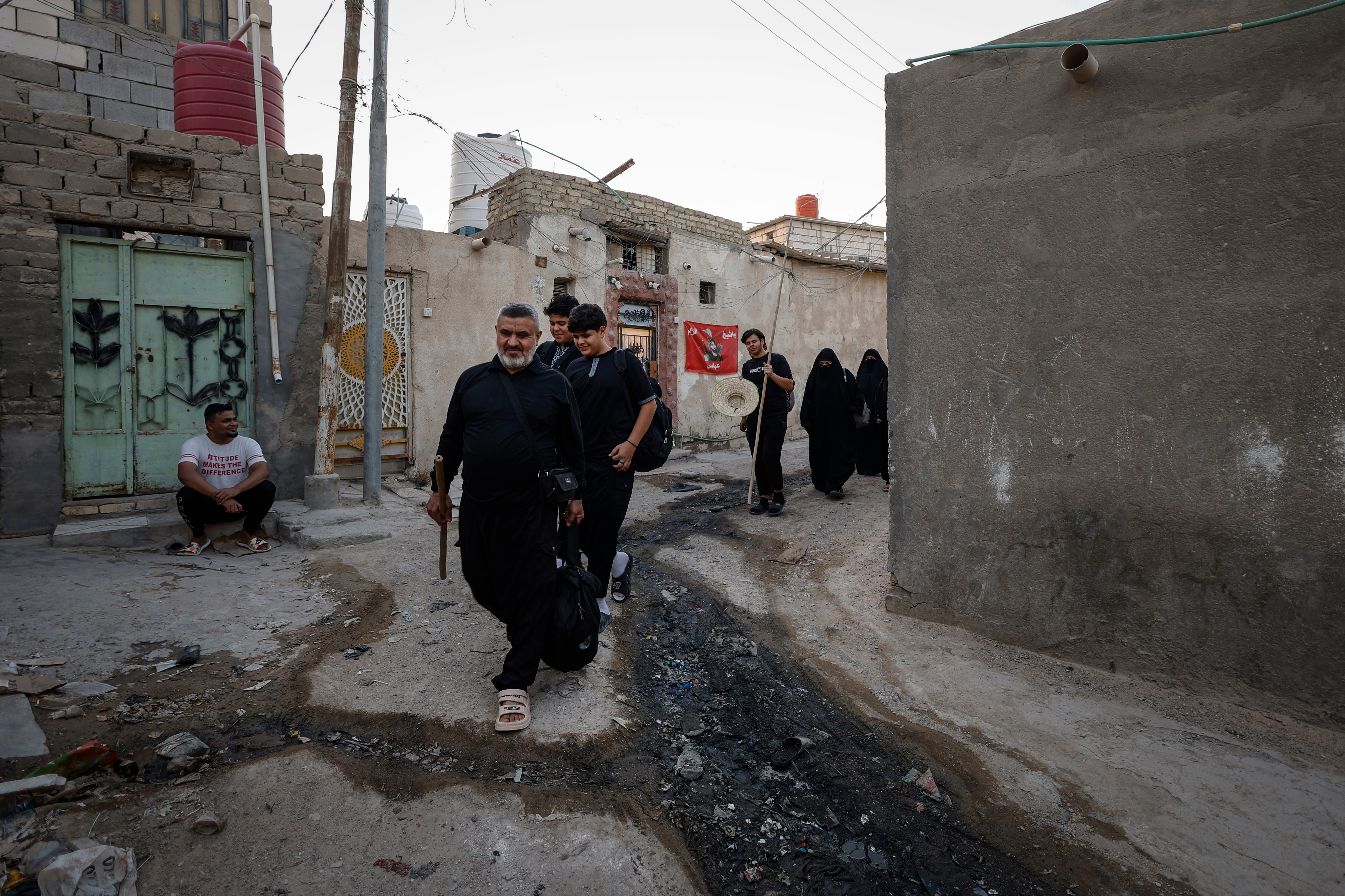 58歲的馬吉德·卡里姆於2025年7月22日與家人離開住所,開始向卡爾巴拉徒步朝聖,這是伊拉克巴士拉在什葉派聖儀阿爾巴因節前的場景。路透社/Alaa al-Marjani