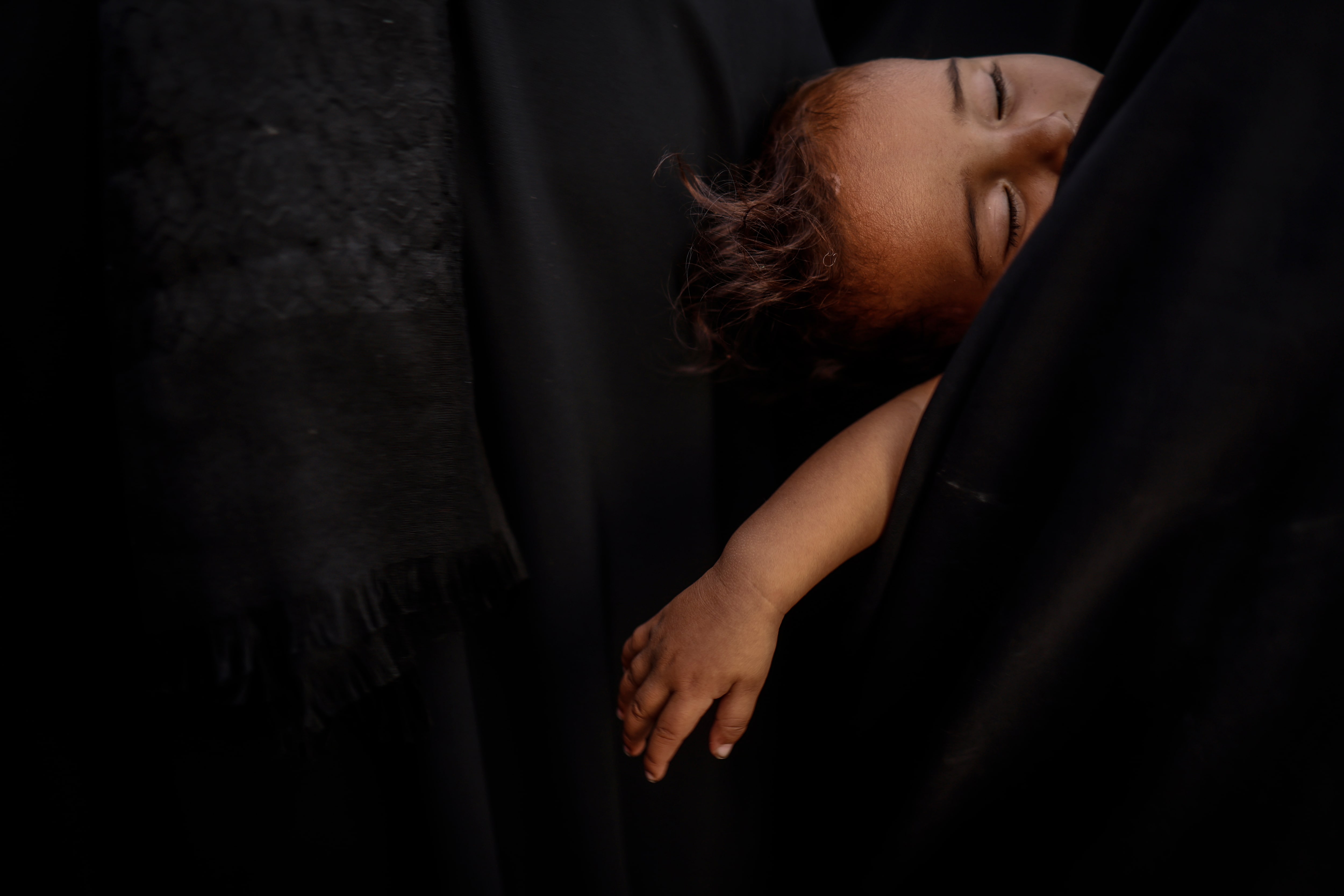 2025年8月11日,在伊拉克聖城卡爾巴拉,一名婦女在阿爾巴因節聖儀前的哀悼儀式中抱着孩子。路透社/Alaa al-Marjani