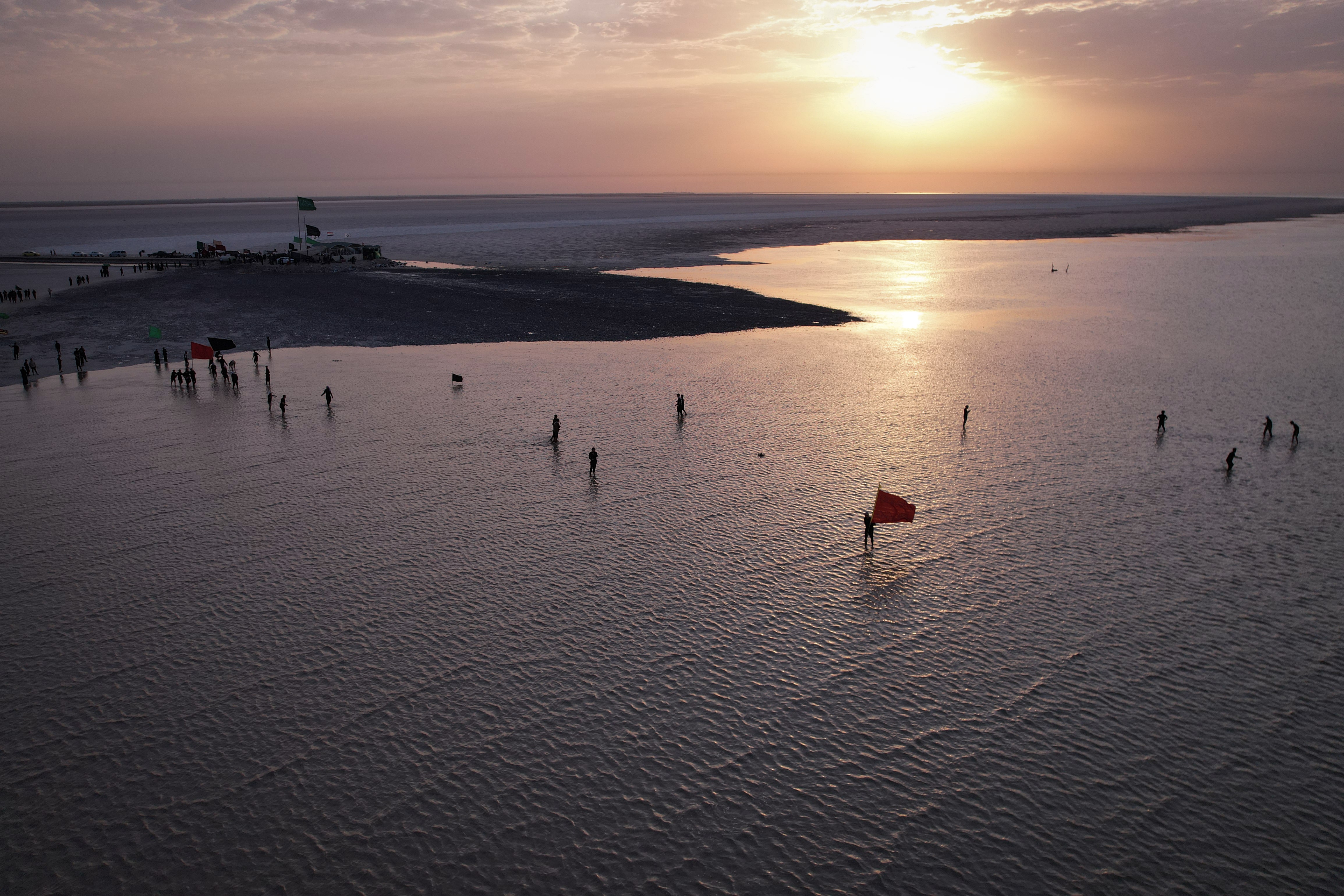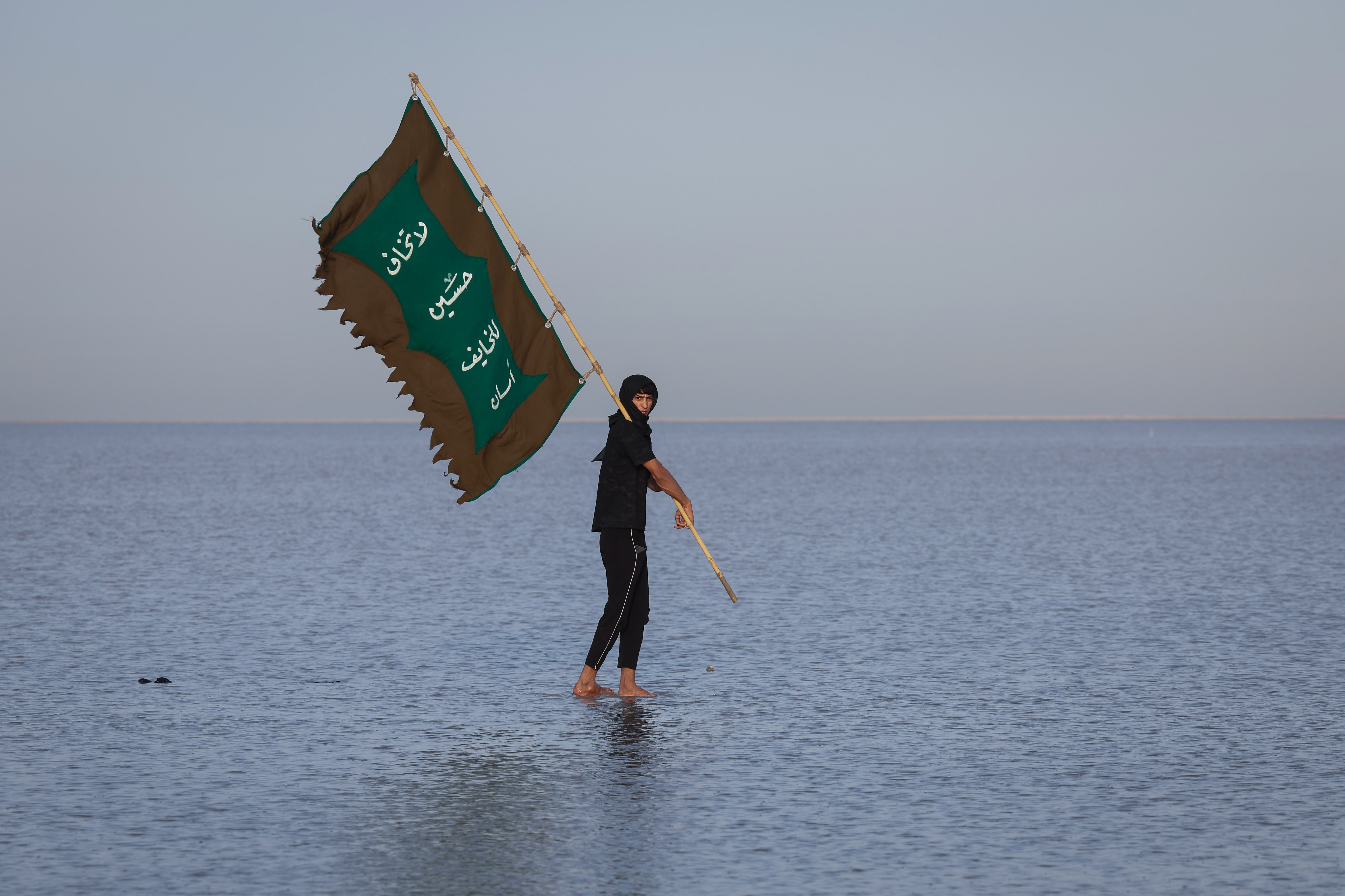 2025年7月21日,伊拉克巴士拉,一位什葉派穆斯林朝聖者手持旗幟,在淺水中行走,這是從伊拉克最南端的Ras al-Bisha地區前往聖城卡爾巴拉的朝聖之旅起點,正值什葉派聖日阿爾巴因前夕。路透社/Alaa al-Marjani