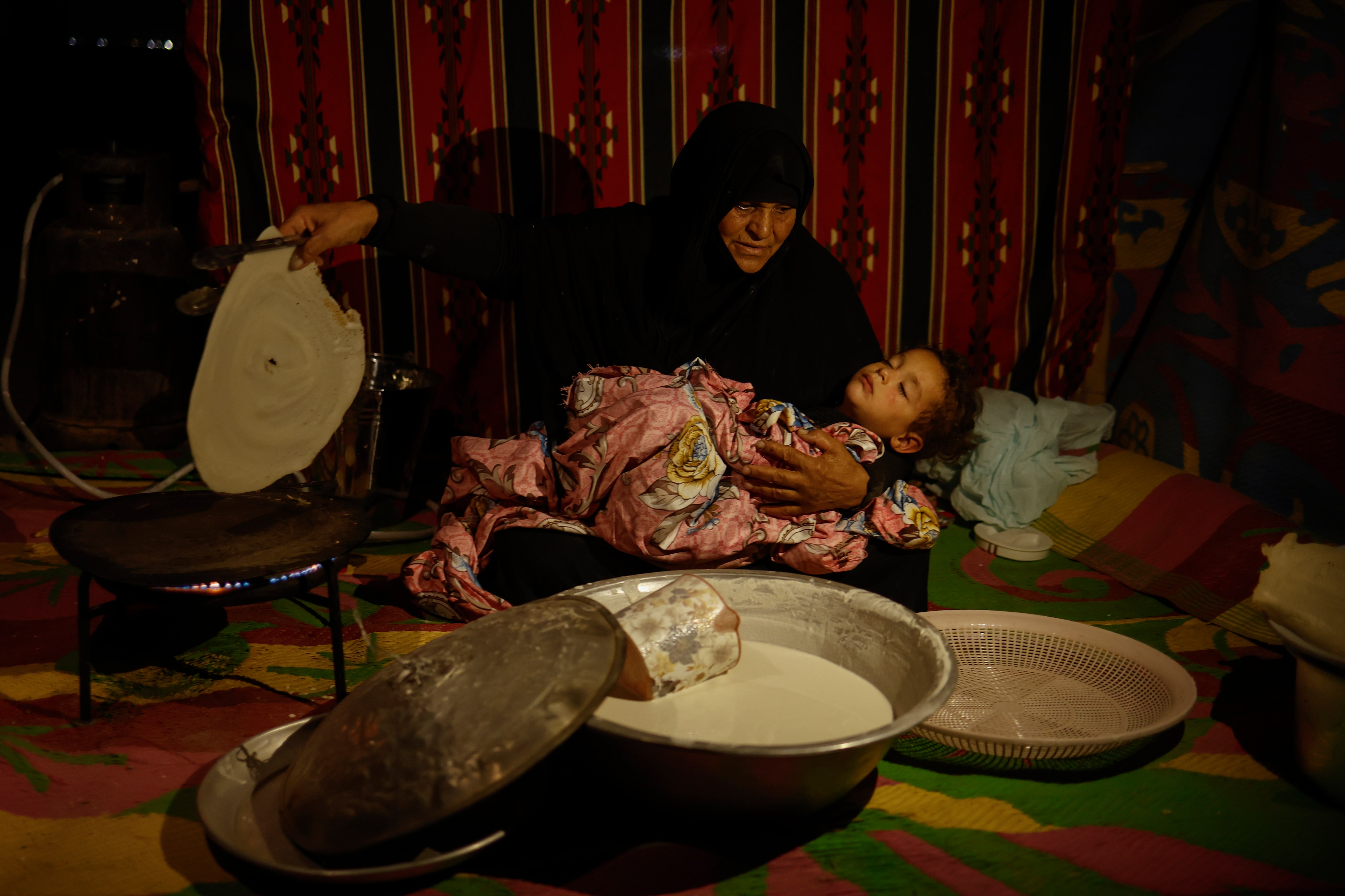 2025年7月27日,伊拉克納西里耶市,Raghad Qased抱着孫女,為前往卡爾巴拉的什葉派穆斯林朝聖者準備麪包,正值阿爾巴因聖日前夕。路透社/Alaa al-Marjani
