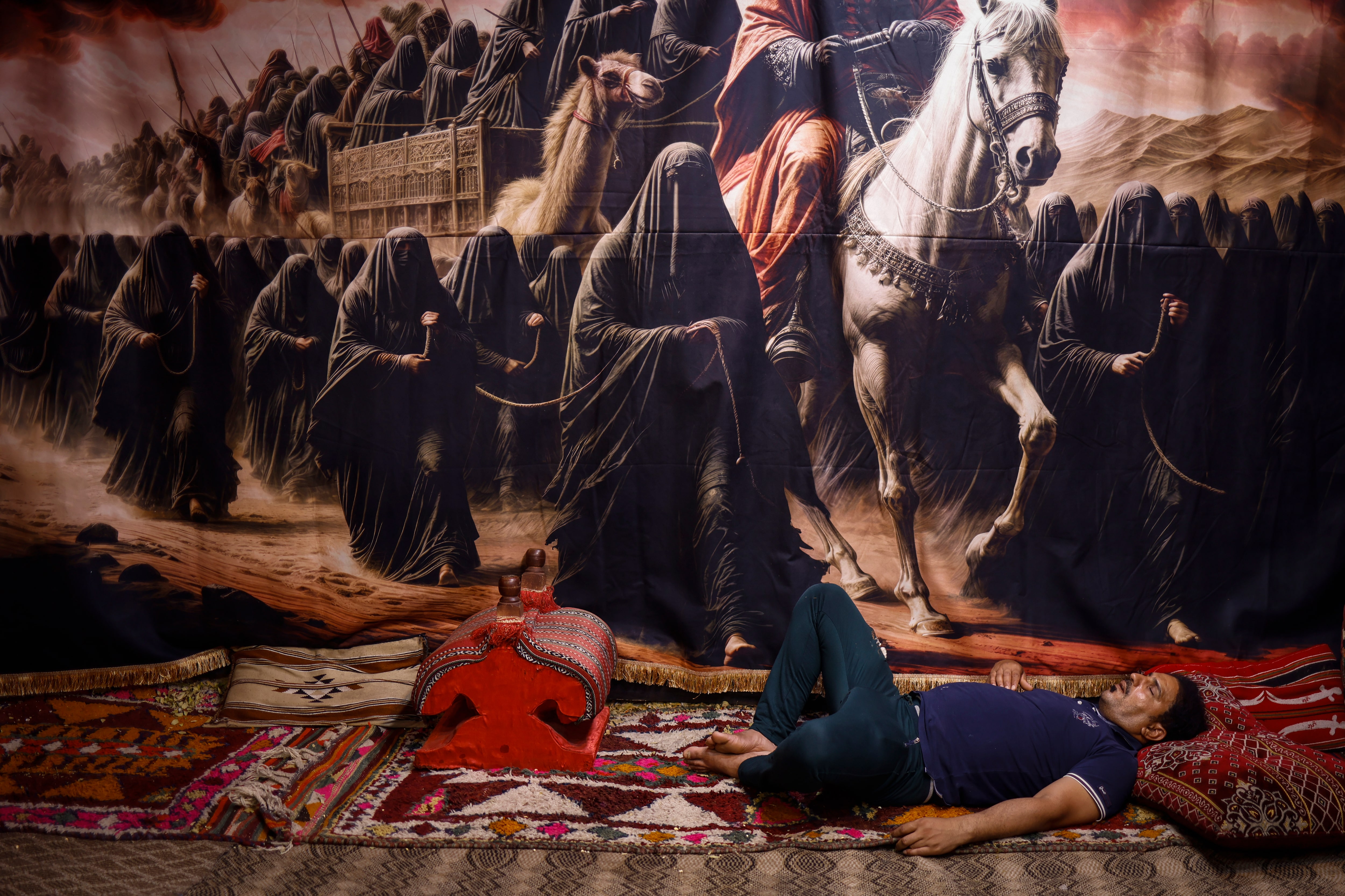 2025年7月23日,伊拉克巴士拉,一名什葉派穆斯林男子在前往聖城卡爾巴拉的徒步朝聖途中,於專為朝聖者休息的帳篷內睡覺,此時正值阿巴因聖日前夕。路透社/Alaa al-Marjani