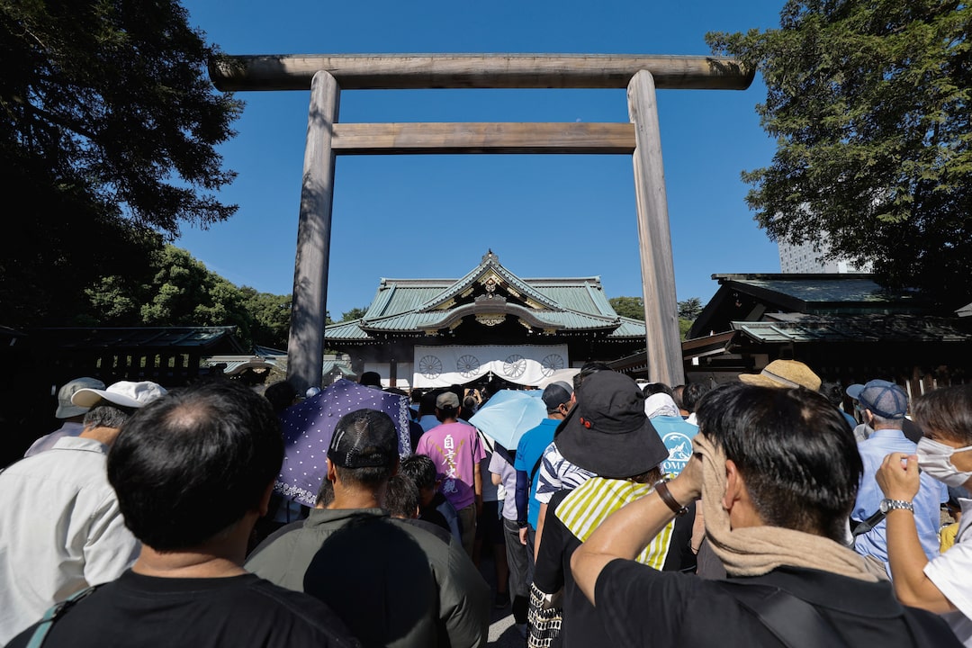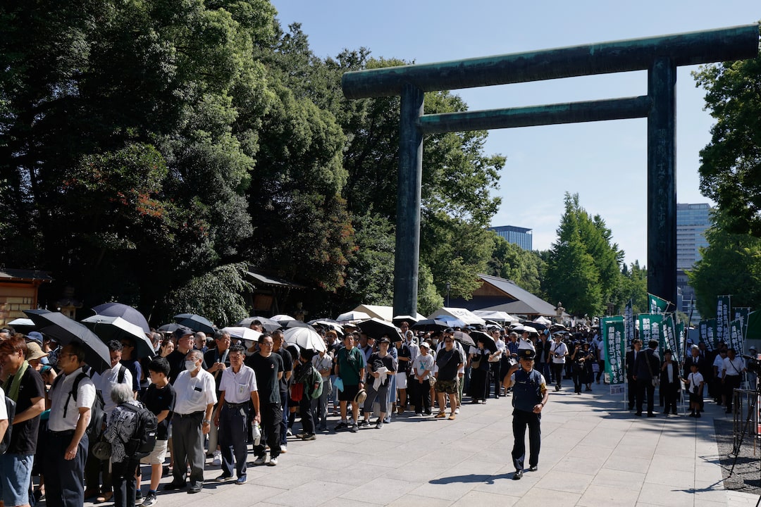 圖1/3:2025年8月15日,日本東京,民眾在二戰日本投降80週年之際排隊參拜靖國神社。路透社/山田真奈美