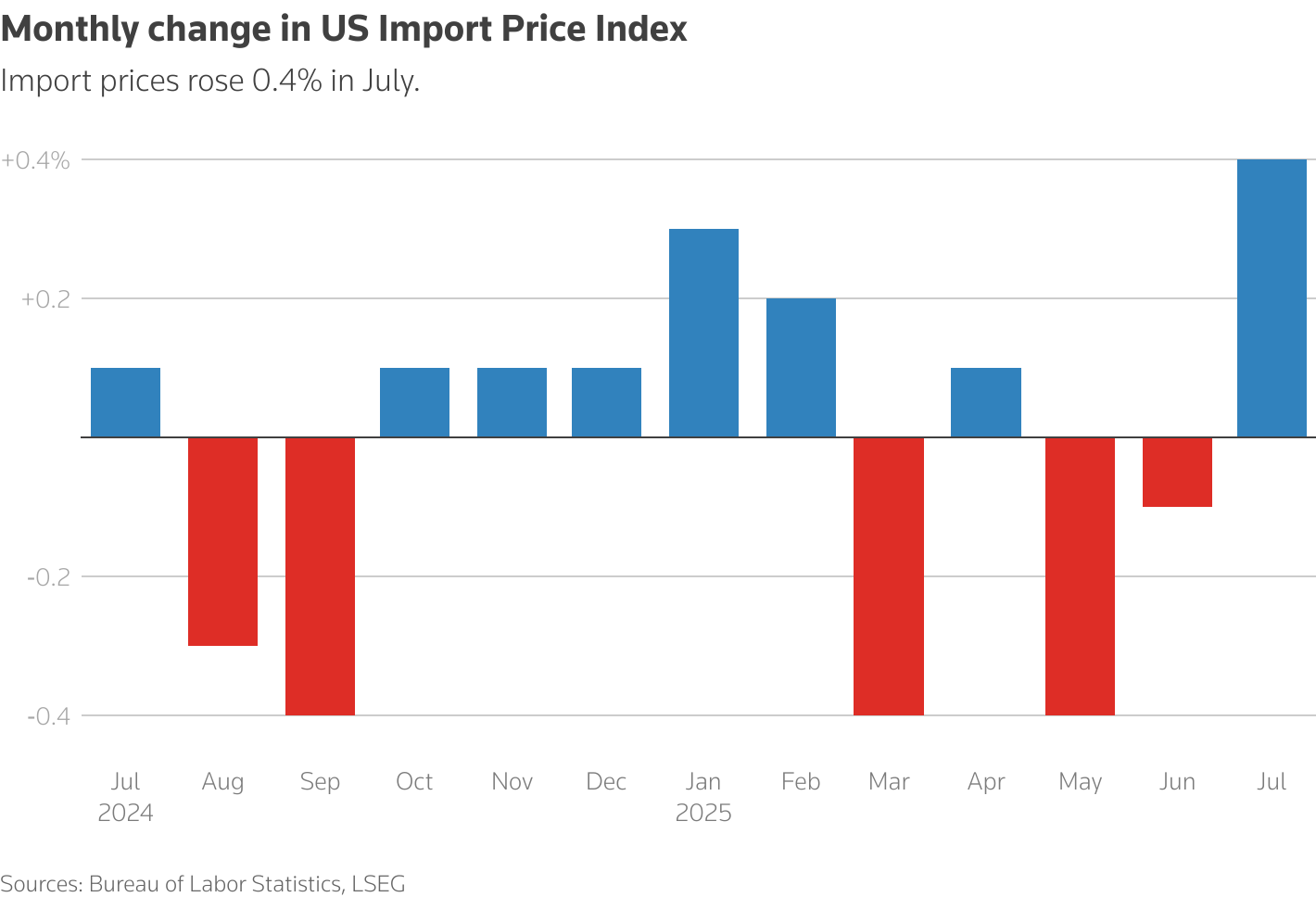 經通脹調整後,經濟學家估計7月核心零售銷售增長0.3%,為第三季度開了個好頭。部分專家指出,消費者展現的韌性跡象加上商品服務價格上漲,都不支持美聯儲下月降息。金融市場目前預期降息將在9月16-17日的央行會議上實現。勞工部統計局另一份報告強化了通脹升温預期,該數據顯示7月進口價格上漲0.4%,消費品成本大幅攀升。