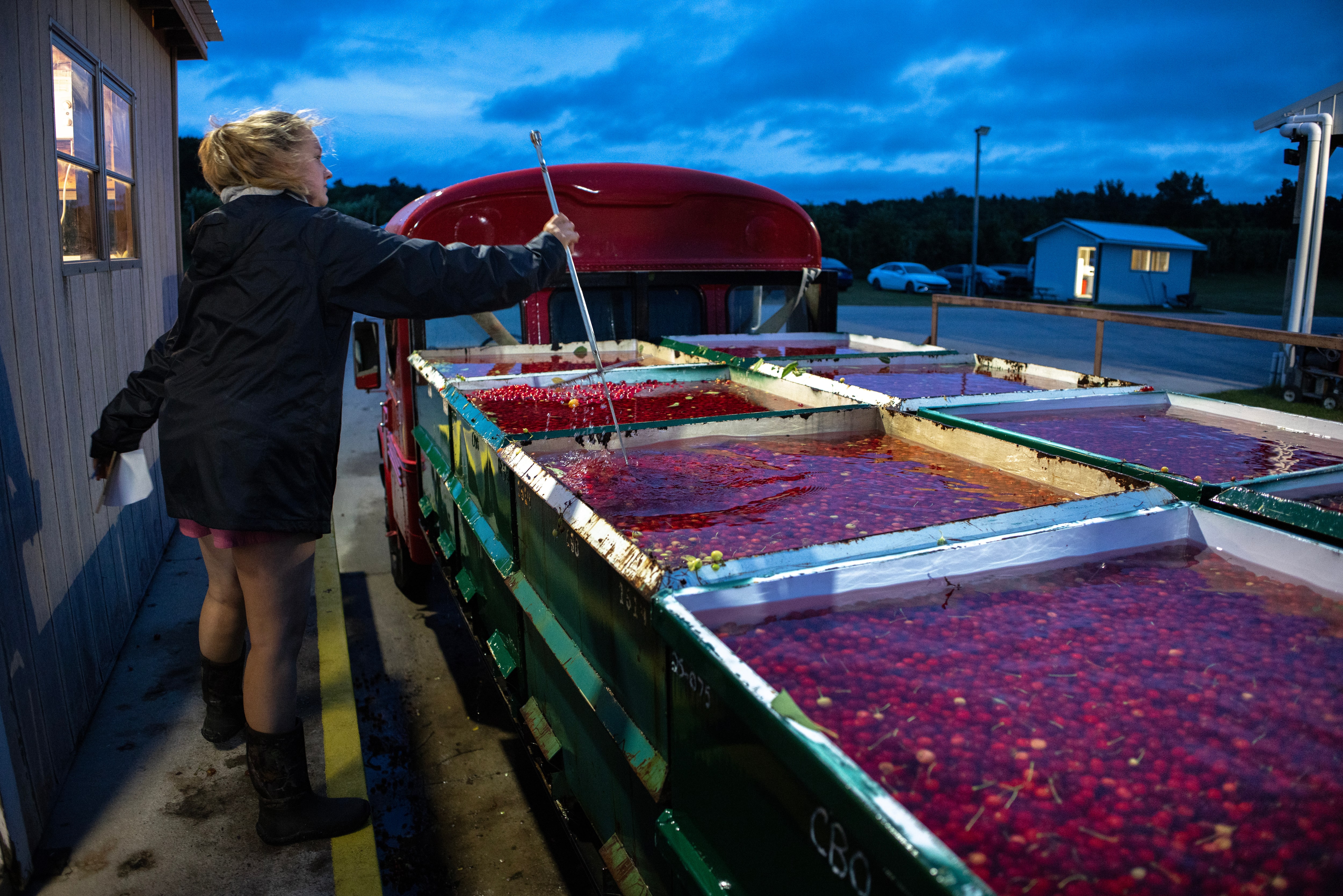 暴雨侵襲薩頓斯灣,酸櫻桃從傳送帶滾入櫻桃灣果園的注水收集箱。工人們在泛光燈下徹夜清理枝葉,與暴風雨賽跑直至破曉。路透社/伊芙琳·霍克斯坦 米茲歐的農場約佔地2500英畝,她領導着酸櫻桃產業貿易組織櫻桃營銷協會。多年來,他們一直試圖重新打開中國市場。