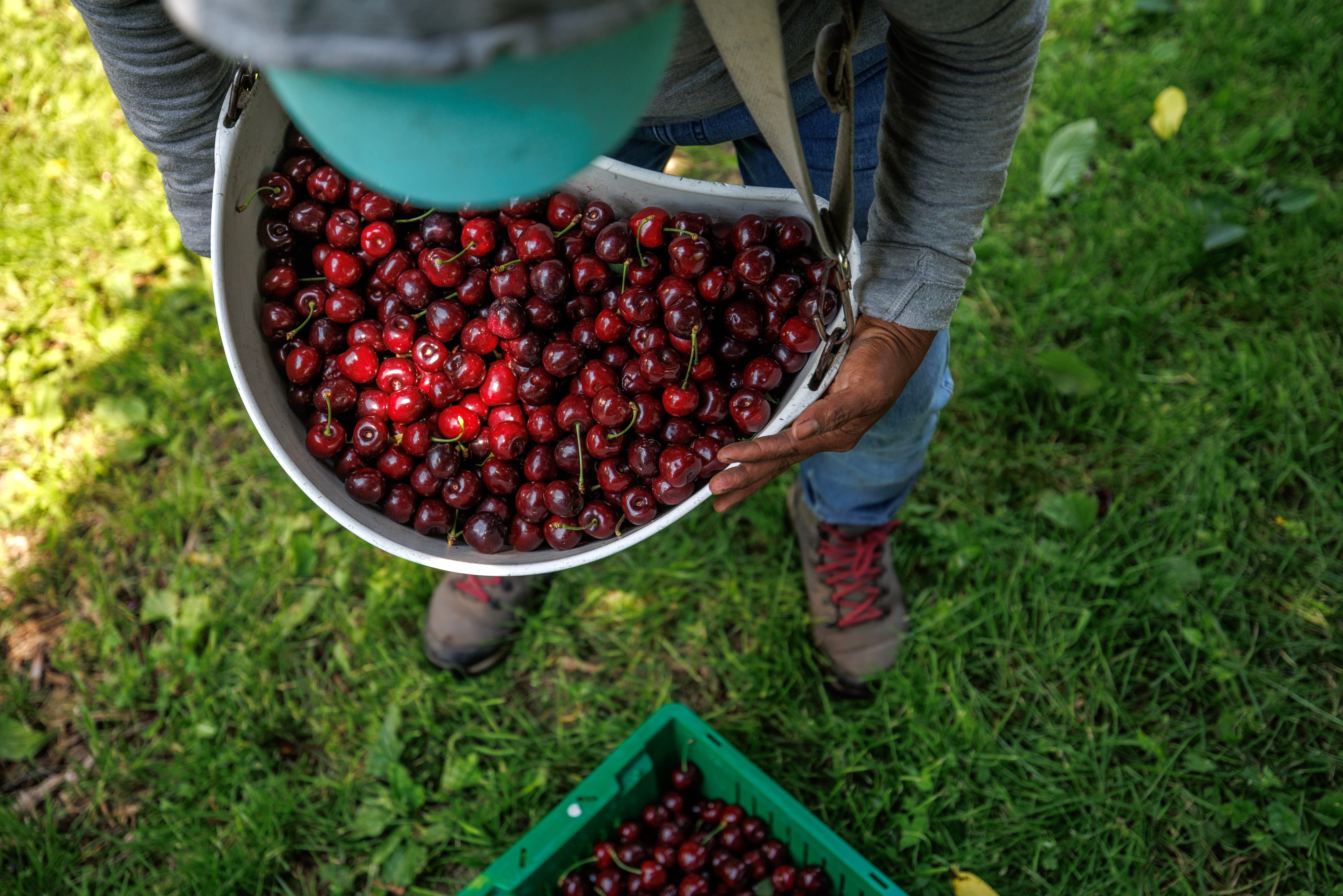 工人們在國王果園採摘甜櫻桃,從運往本州客户的貨箱中清除雜物。雖然密歇根州大部分甜櫻桃在國內銷售,但該州酸櫻桃產品的出口市場受到特朗普時代貿易政策的衝擊。路透社/伊芙琳·霍克斯坦
