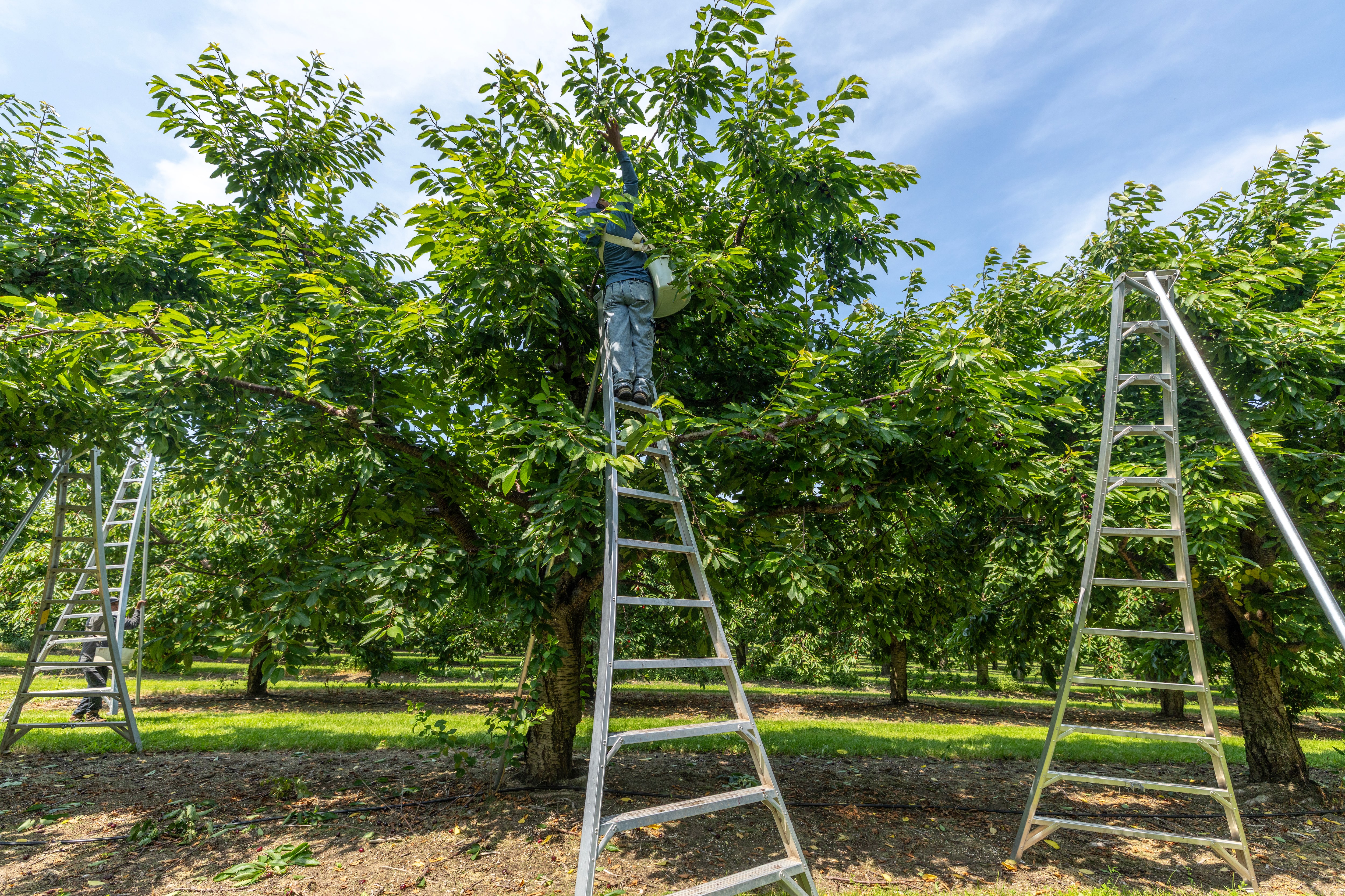 密歇根州中湖市金氏果園裏,一名採收工人正從梯子上摘取櫻桃。他們來自危地馬拉的季節性務工團隊因H-2A簽證延誤,直到七月中旬才人手不足地遲到了數週。路透社/伊芙琳·霍克斯坦
