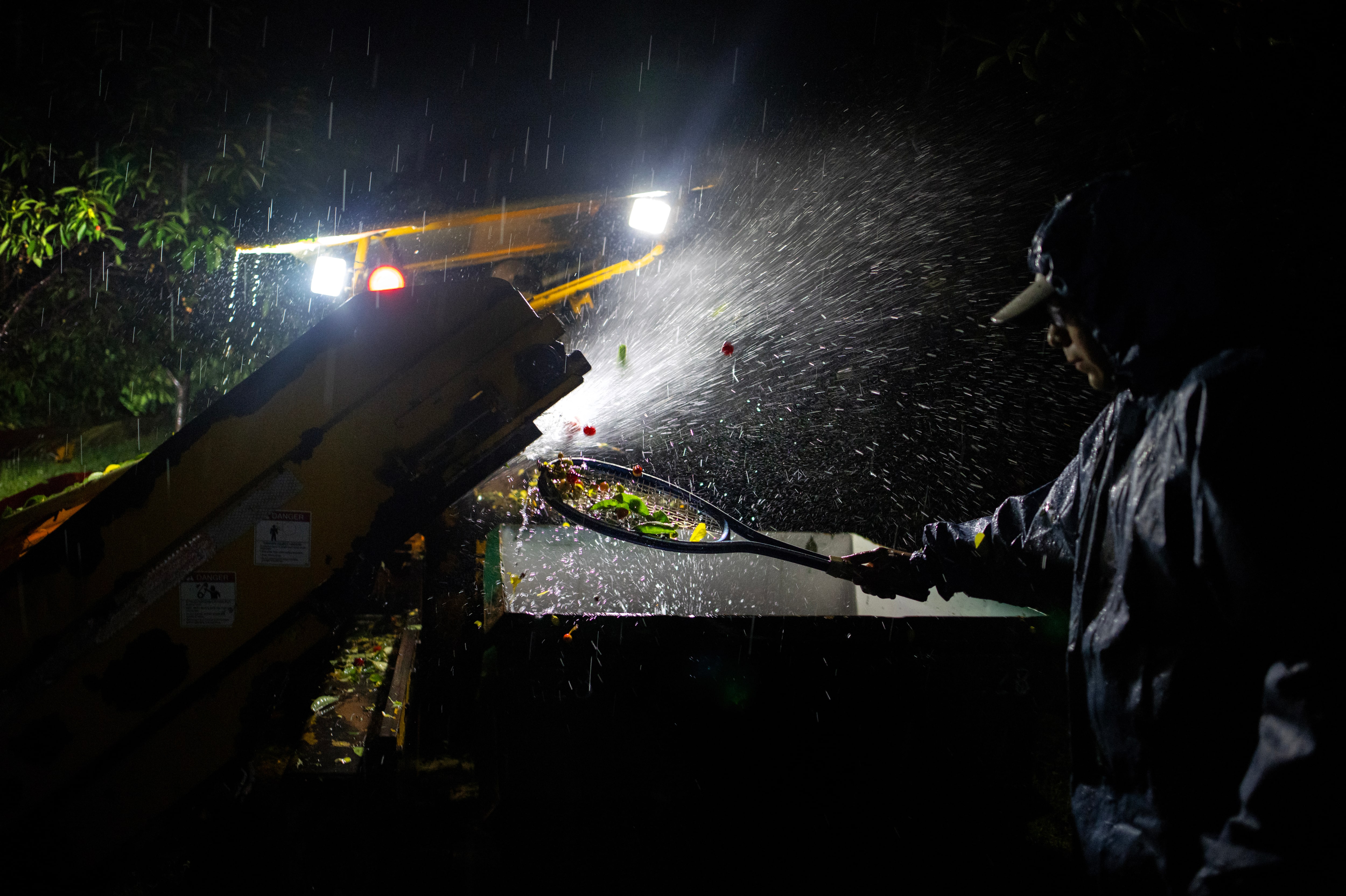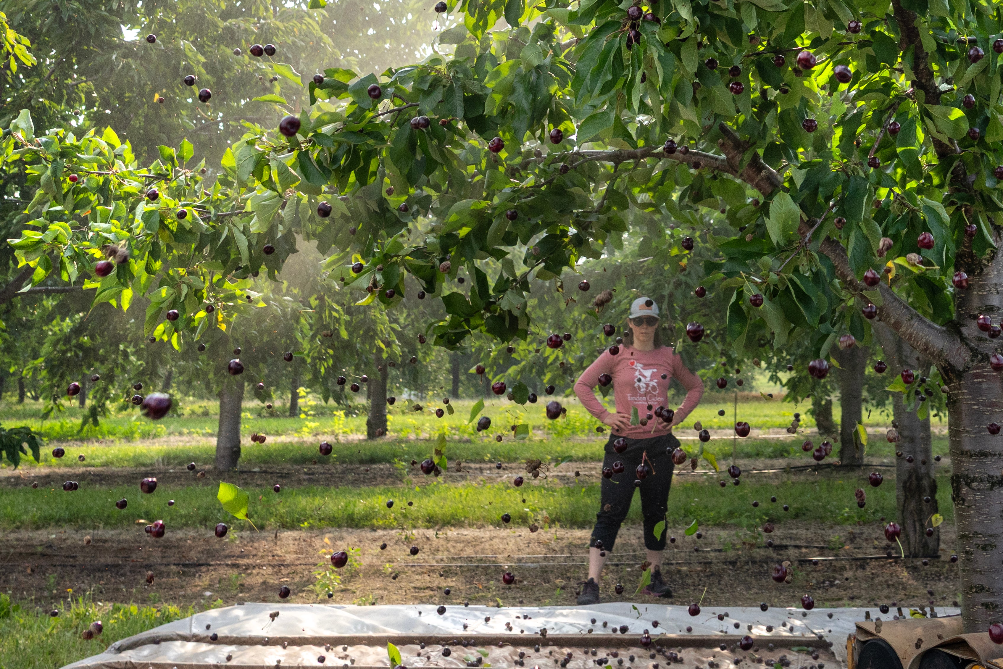 一名工人操縱着低矮的搖樹機夾緊樹幹,酸櫻桃如紅色冰雹般落入收集架,通過漏斗進入果箱。另一名工人快速清理着枝葉,與黎明爭分奪秒。在預冷站,一名密歇根州立大學的實習生記錄着每輛滿載水果的卡車——這些櫻桃將在清晨前完成冷卻和加工。