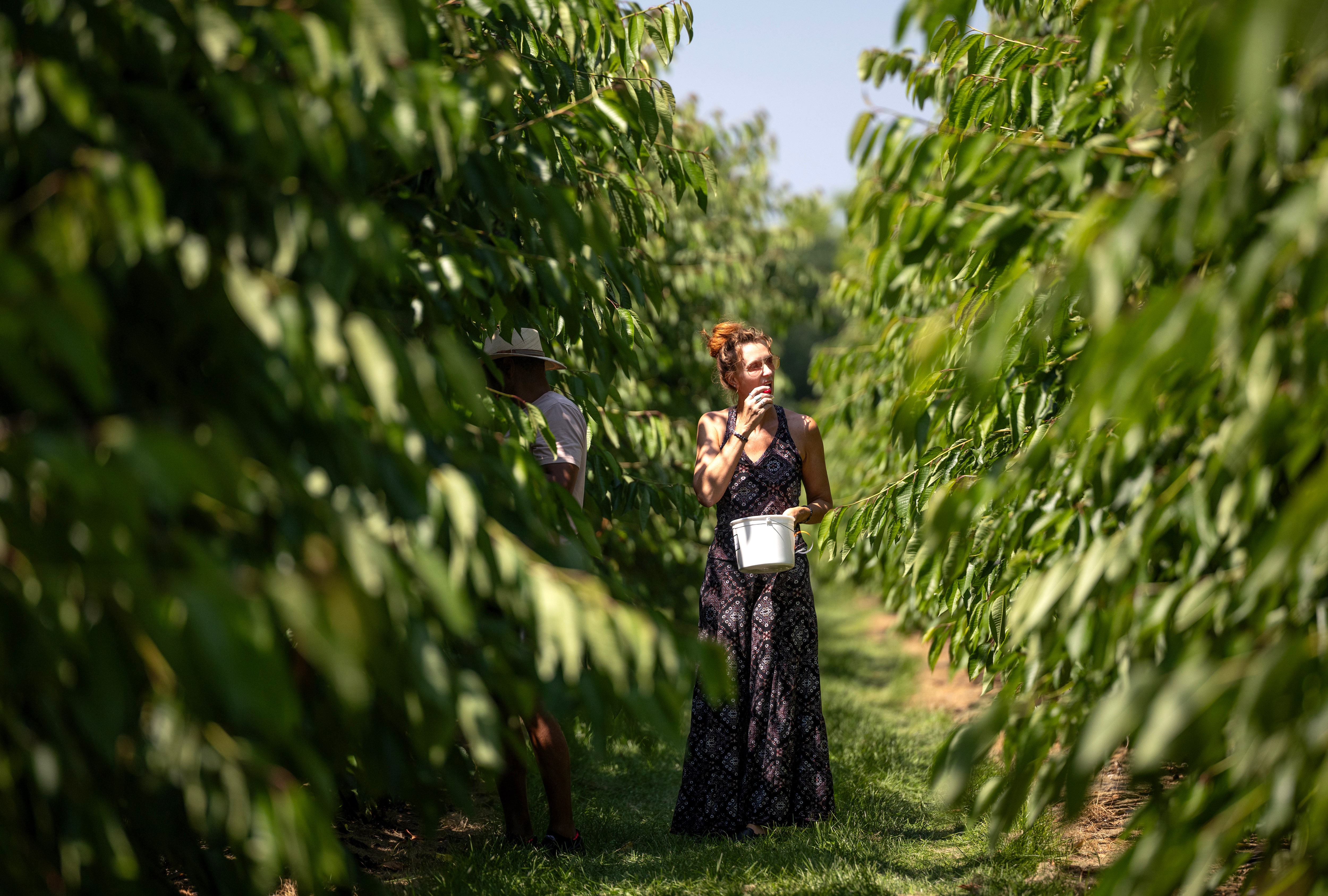 一位自採水果的遊客在金氏果園的櫻桃樹間漫步時品嚐櫻桃。該農場種植用於製作餡餅、果乾和濃縮果汁的酸櫻桃,以及供應市場和農場遊客的甜櫻桃。路透社/伊芙琳·霍克斯坦