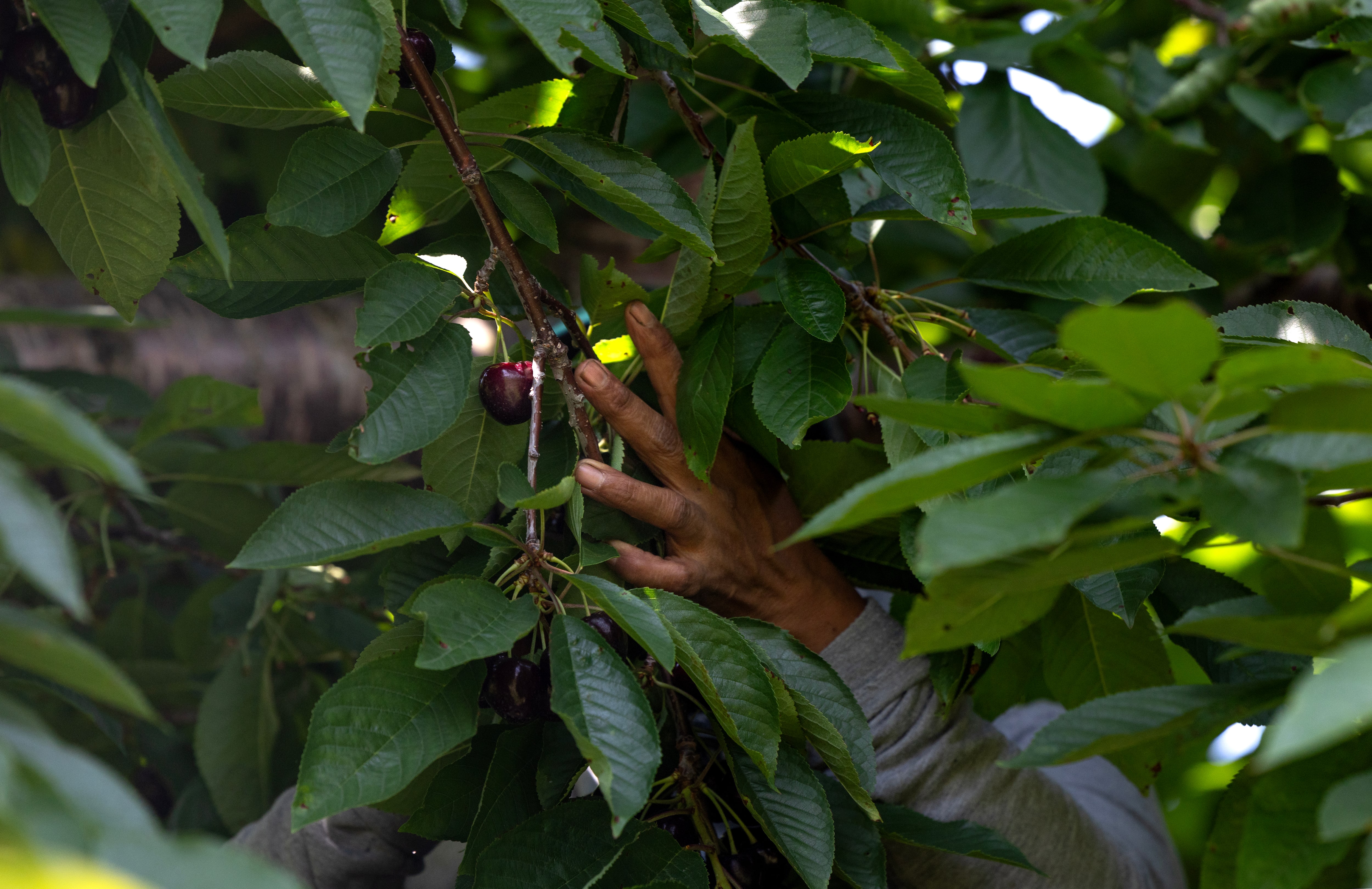 金氏果園內,一名H-2A農業工人將剛採摘的櫻桃整箱倒入集裝筐。許多人年復一年返回這裏,練就了識別冰雹痕跡和挑選青翠果柄以吸引顧客的火眼金睛。路透社/伊芙琳·霍克斯坦