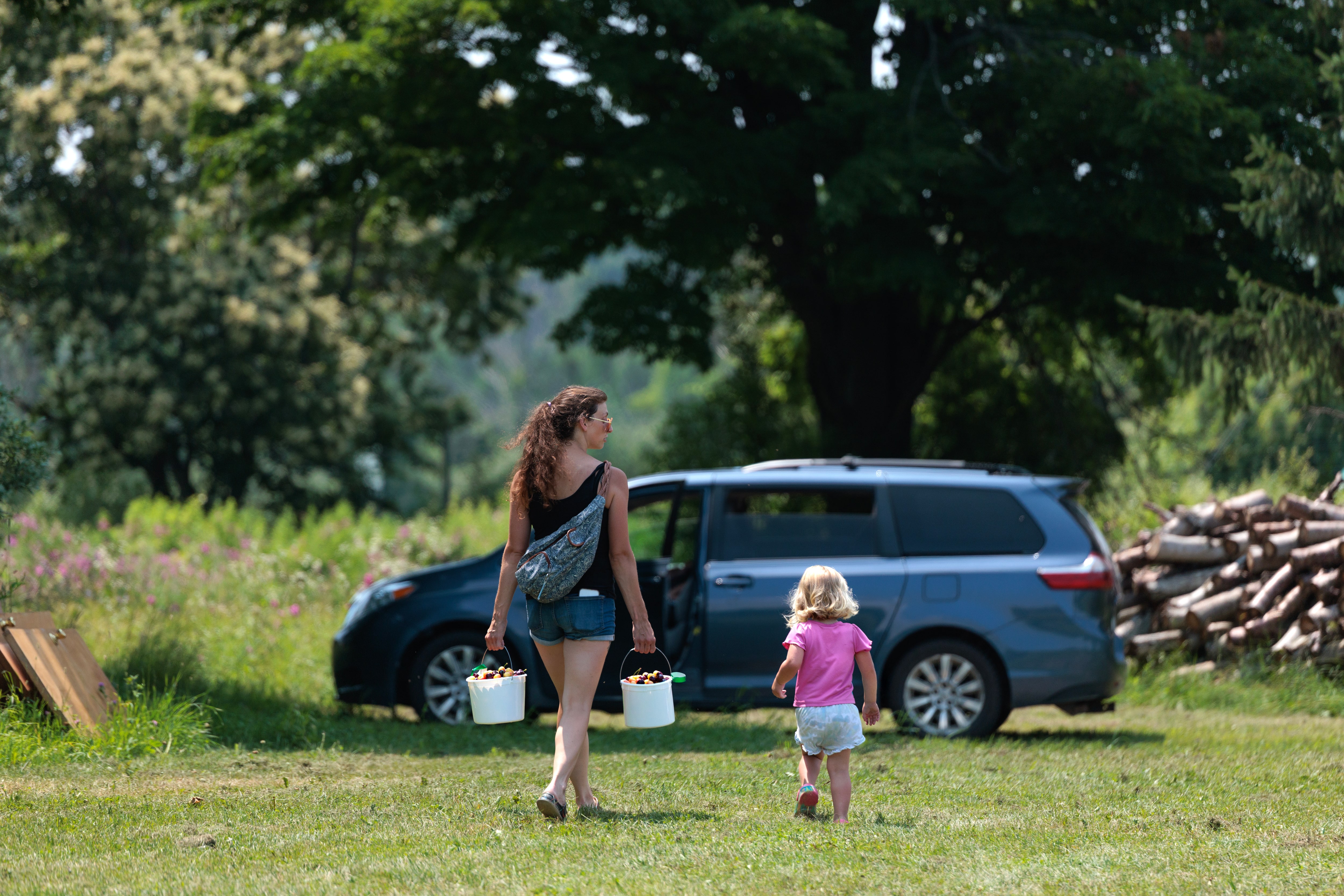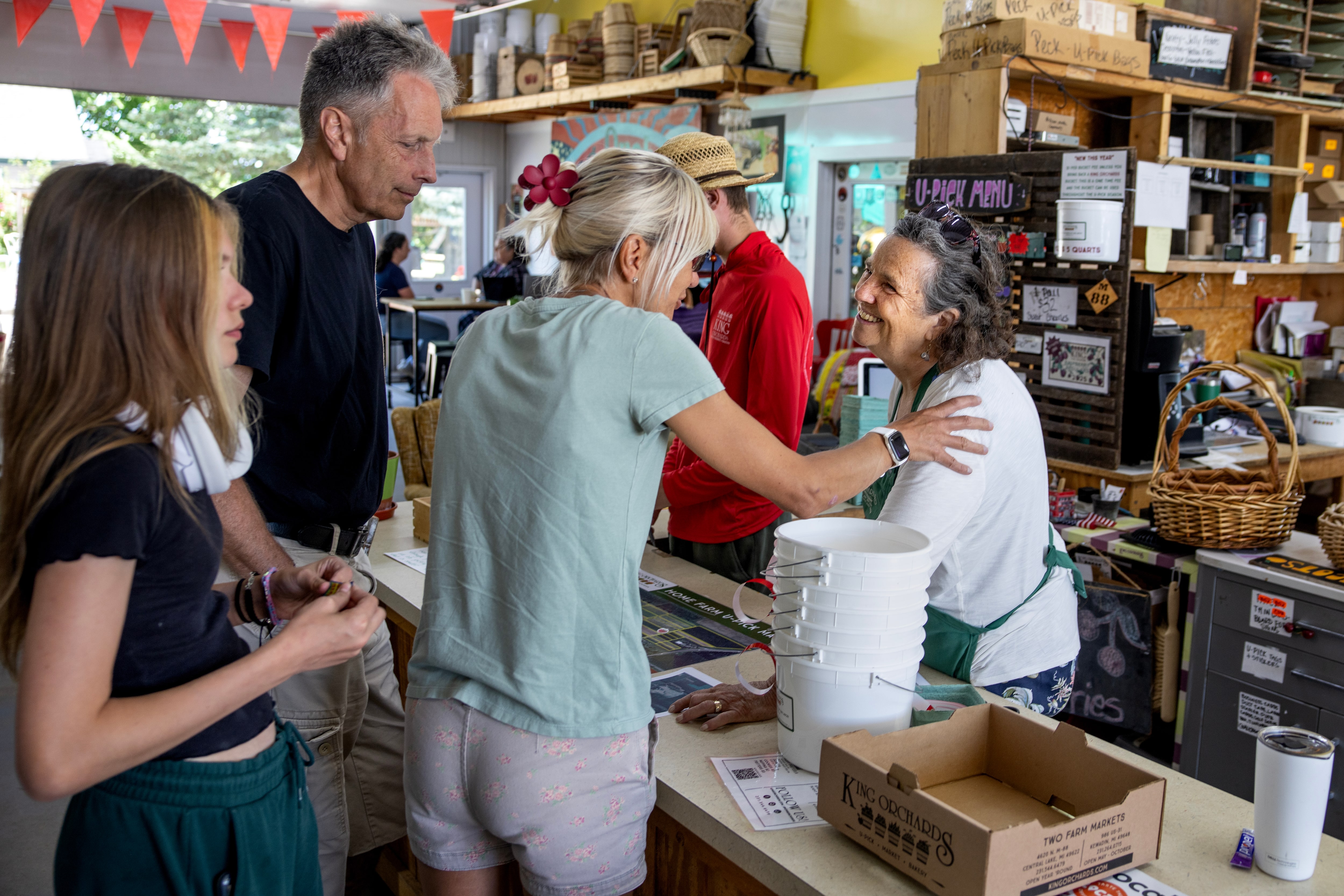 貝琪·金正在與購買採摘桶的顧客交談。隨着成本上升,金氏家族與該地區許多種植者一樣發展起農業旅遊,迎接渴望體驗農場生活的遊客。路透社/伊芙琳·霍克斯坦