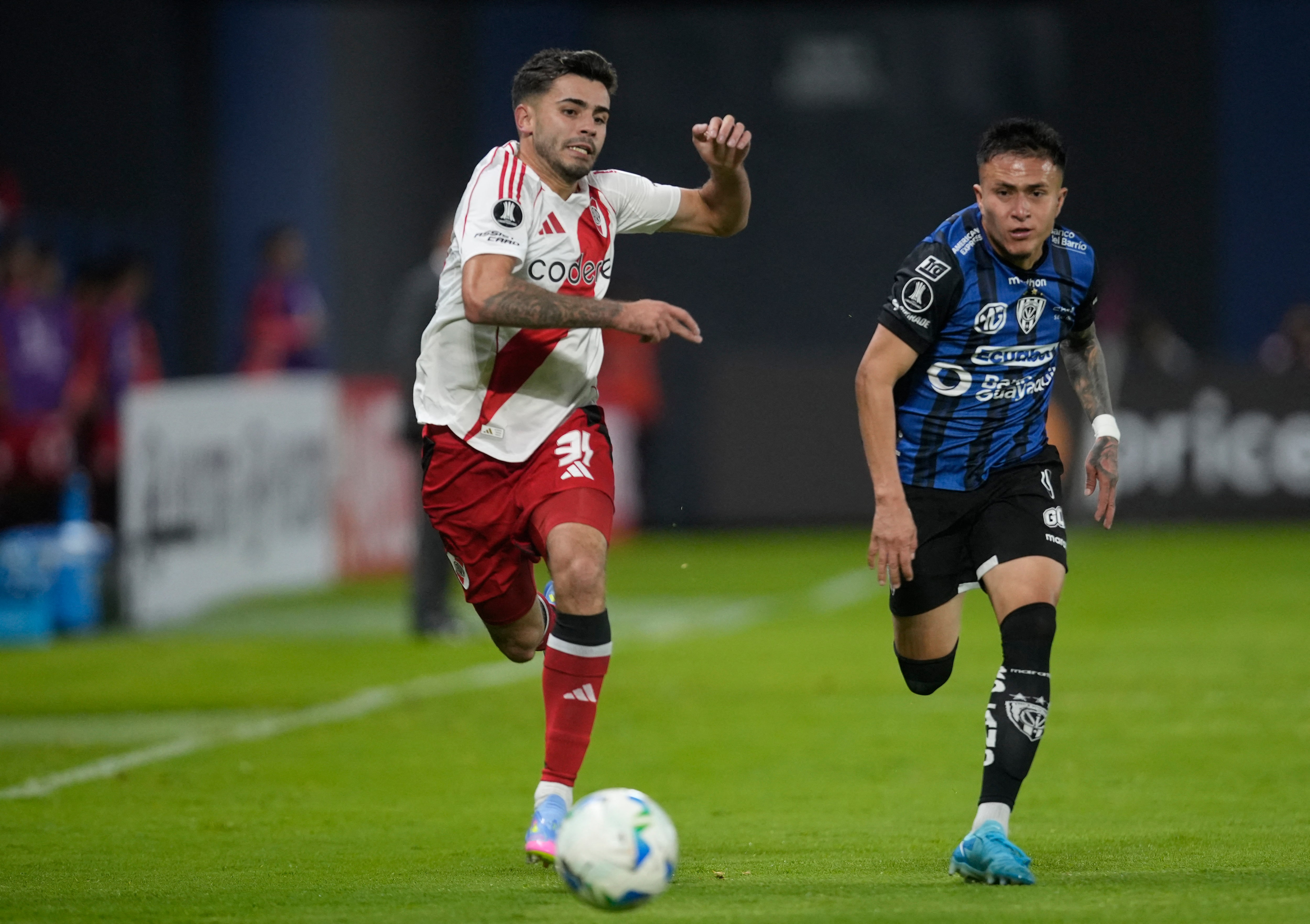 聖地亞哥·西蒙在河牀隊與山谷獨立隊的解放者杯比賽中帶球的檔案照片。厄瓜多爾基多,瓜亞基爾銀行體育場。2025年4月23日。