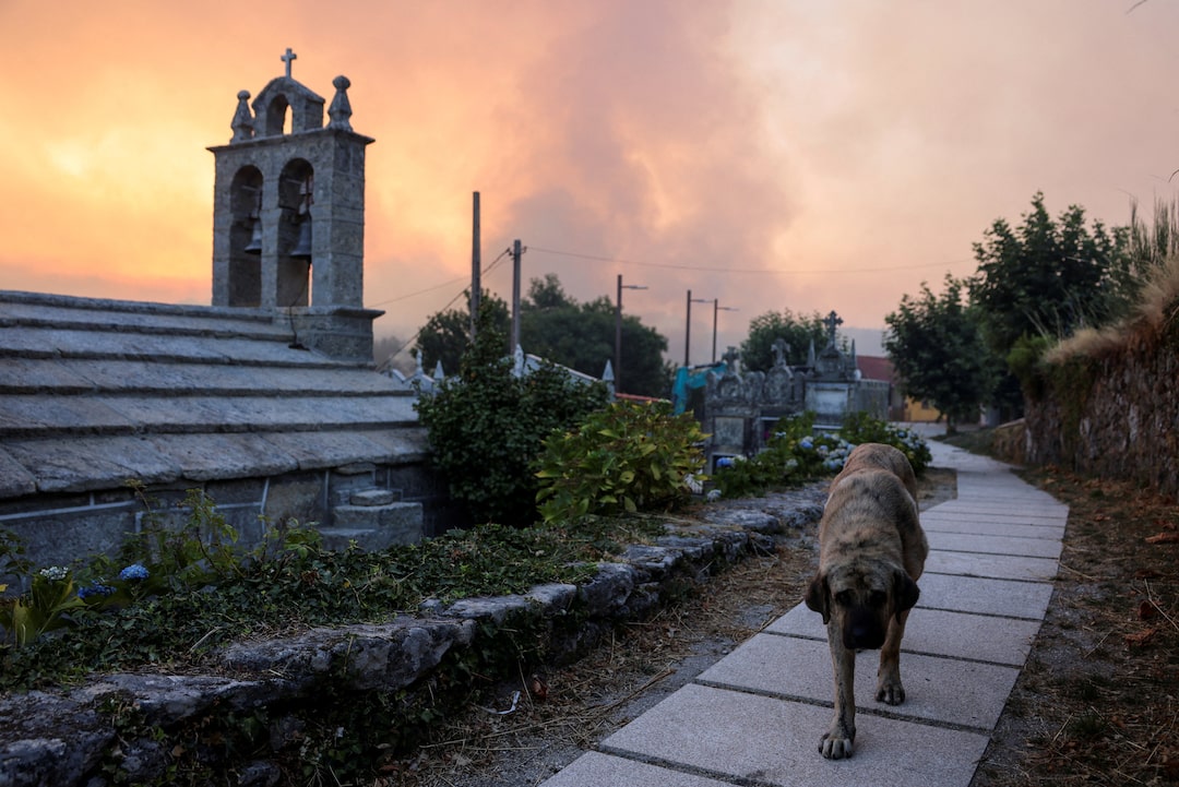 2025年8月16日,西班牙加利西亞奧倫塞省阿費爾莫薩斯,一隻狗走過墓地,野火產生的濃煙升起。路透社/納喬·多斯 購買授權 權利, 打開新標籤頁比利亞德沃斯,8月17日(路透社)——週日,酷熱天氣阻礙了西班牙境內20處重大野火的撲救工作,促使政府從軍事應急部隊增派500名士兵支援滅火行動。
