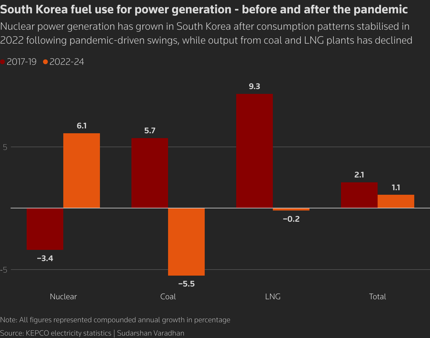韓國電力公司(KEPCO)數據顯示,截至6月的六個月內,核電發電量同比增長8.7%——是官方2.9%年增長目標的三倍——而燃煤發電量驟降16%。