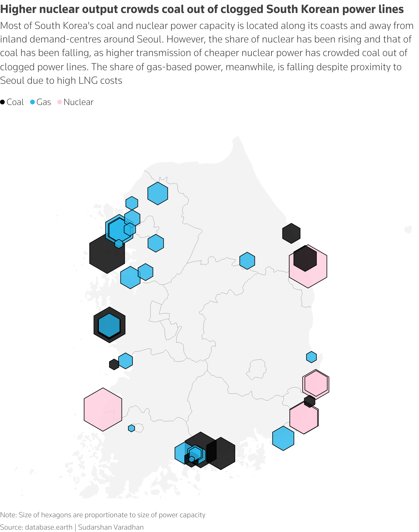 在韓國,核電的增長正在擠佔燃煤電廠的輸電線路容量。