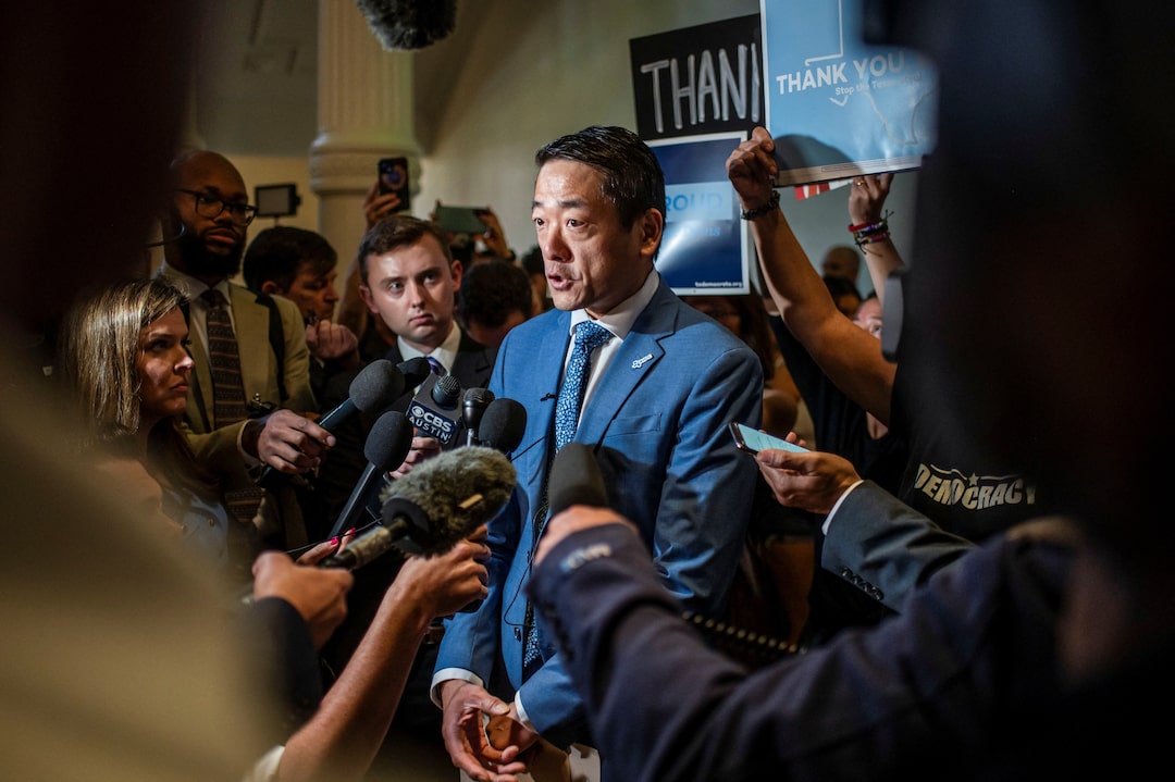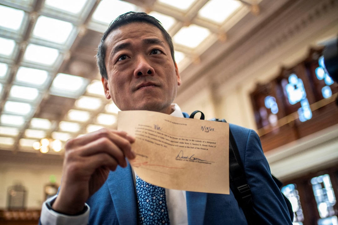 7項中的第1項 美國德克薩斯州奧斯汀,2025年8月18日,民主黨眾議員Gene Wu在一次會議後與媒體交談,民主黨議員們離開該州以阻止共和黨重新劃分該州38個國會選區的機會,開始返回德克薩斯州議會大廈。路透社/Sergio Flores