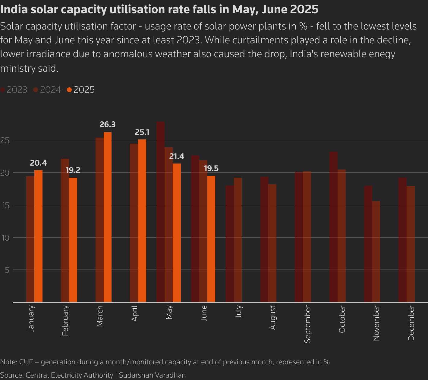 太陽能容量利用率係數(太陽能發電廠使用率百分比)在今年5月和6月降至至少自2023年以來的最低水平