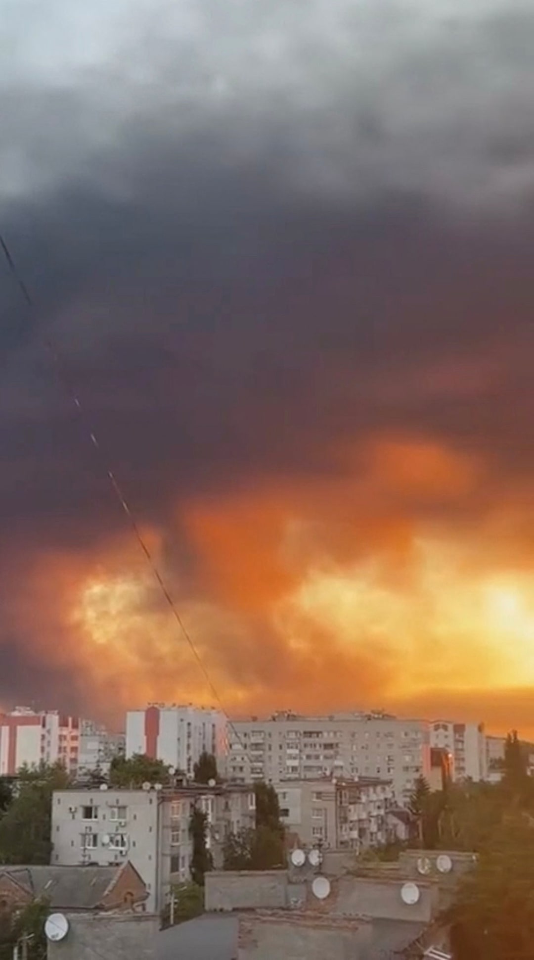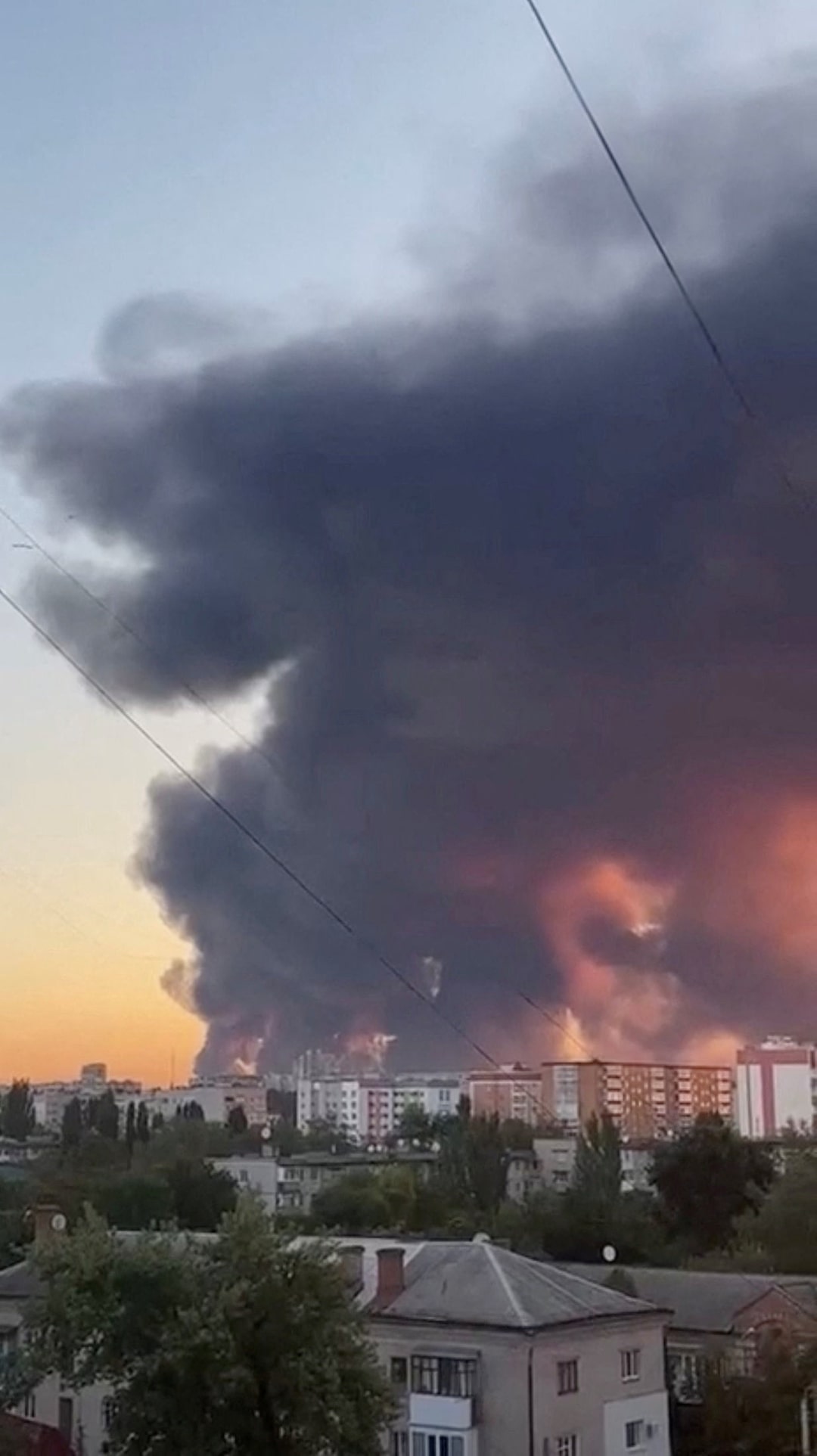圖1/2 2025年8月19日,俄烏戰爭期間,俄羅斯無人機和導彈夜間襲擊波爾塔瓦州克列緬丘克能源設施後濃煙升騰的畫面。此靜態圖片源自路透社獲取的社交媒體視頻
