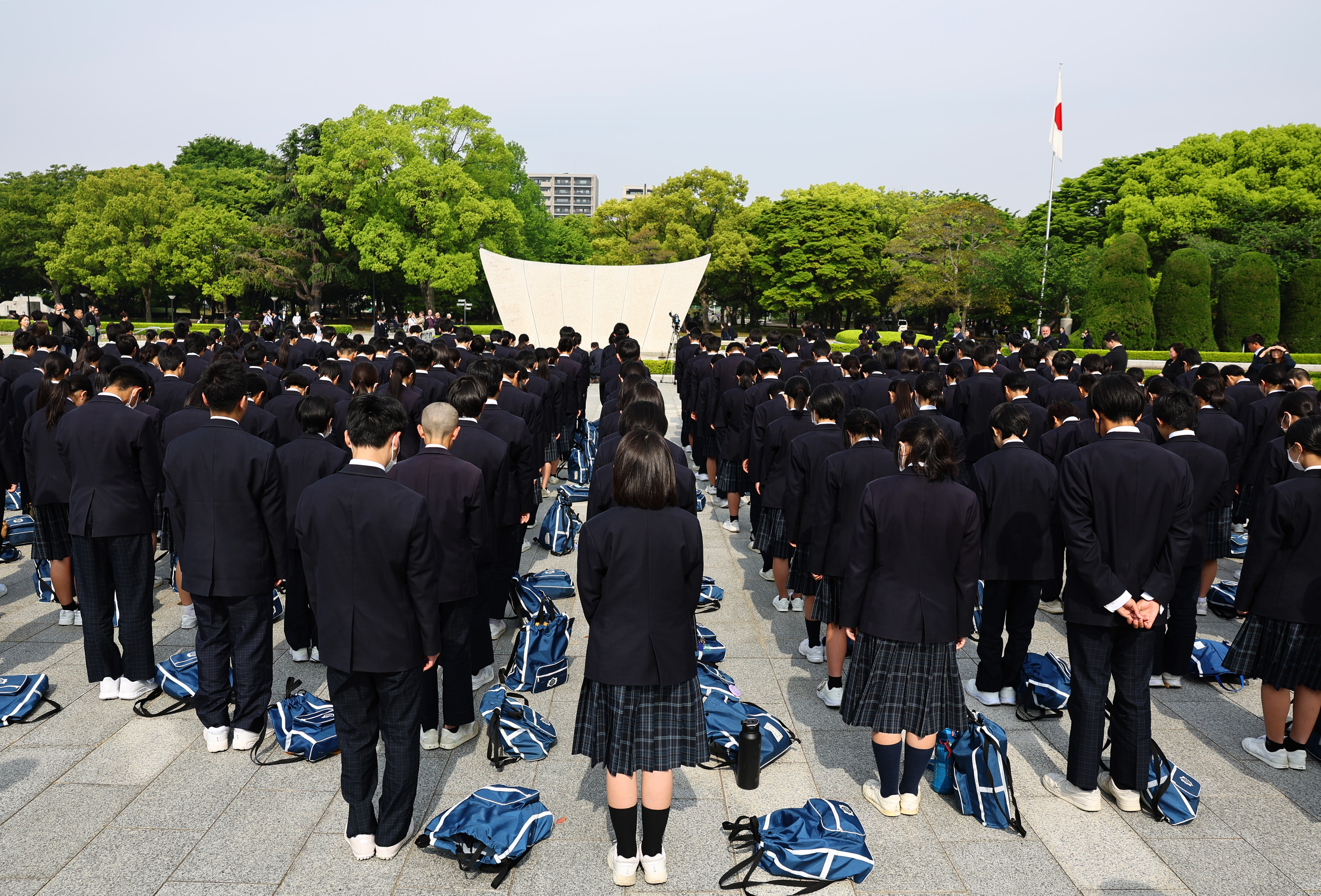 今年四月,學生們在廣島和平紀念公園為1945年原子彈爆炸遇難者默哀。本月初日本剛紀念了廣島核爆80週年。路透社/Kim Kyung-Hoon