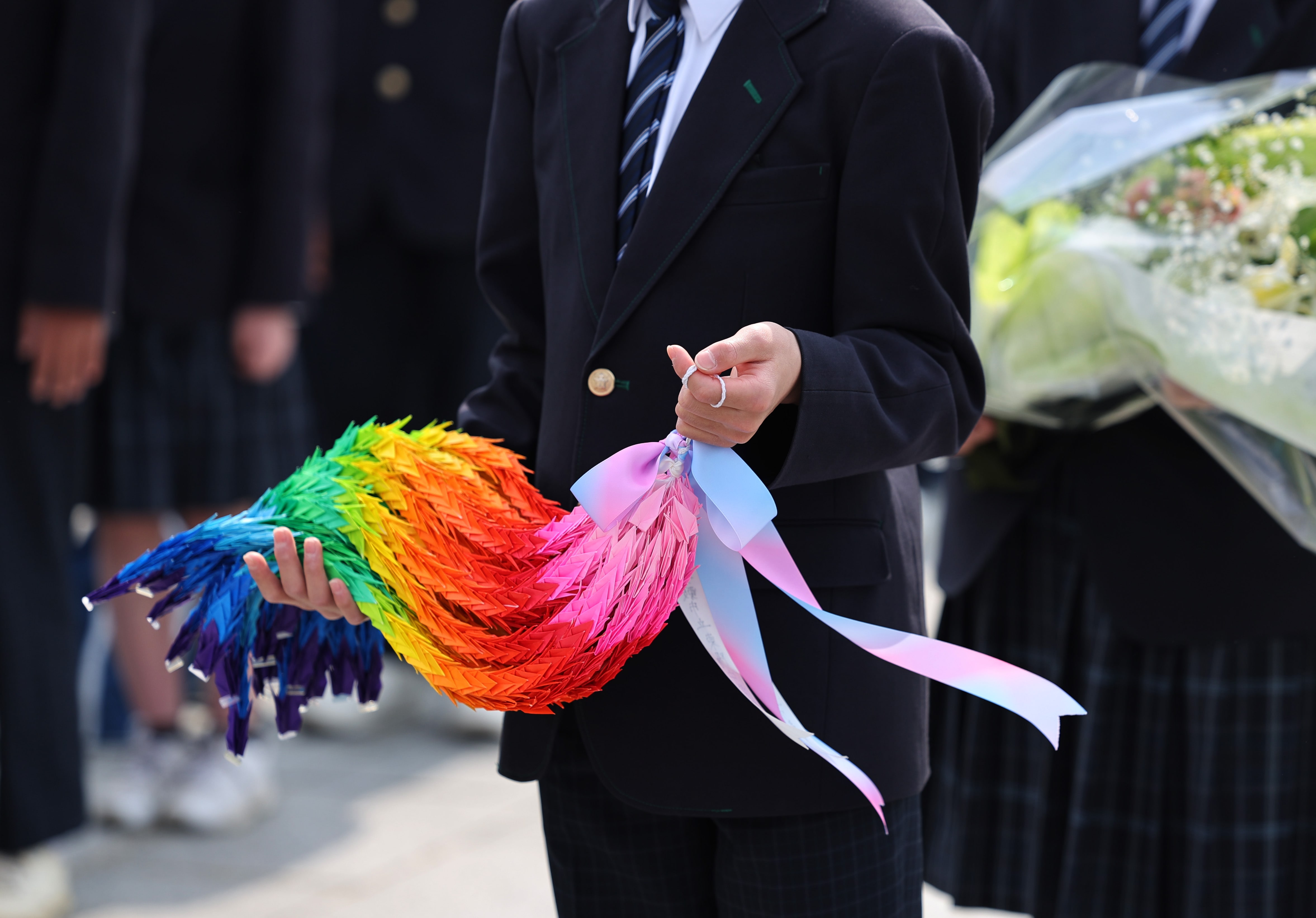 一名學生在廣島和平紀念公園手持紙鶴,為原子彈爆炸遇難者默哀。民意調查顯示,日本年輕一代越來越不願沉湎於這座城市的歷史傷痛。路透社/Kim Kyung-Hoon有跡象表明,即使在本月初剛舉行完原子彈爆炸80週年紀念活動的廣島,越來越多人開始迴避歷史創傷。