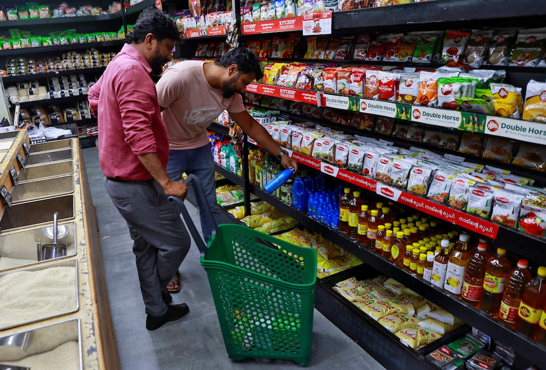 圖1/4:2025年7月23日,印度科欽一家零售店內,顧客在購買前檢查一瓶椰子油。路透社/Sivaram V
