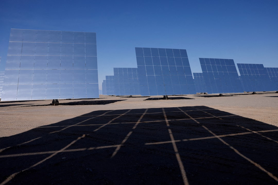 2024年10月16日,中國甘肅省敦煌光伏產業園組織的媒體參觀活動中,敦煌首航100兆瓦塔式光熱發電項目現場的反光鏡陣列景觀。路透社/Tingshu Wang/檔案照片