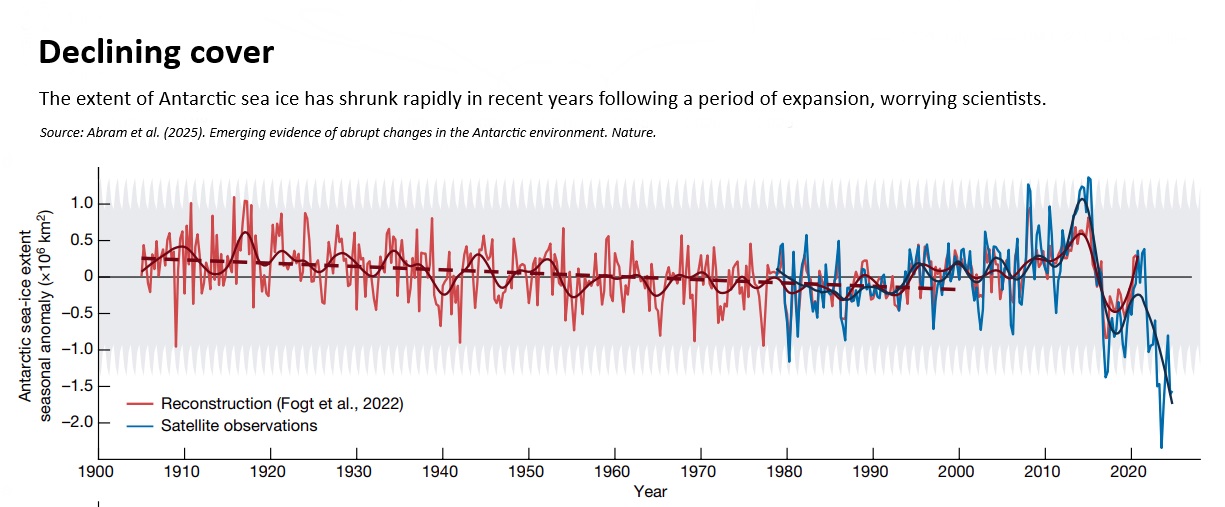 圖表顯示自20世紀初以來南極海冰範圍的季節性異常變化。