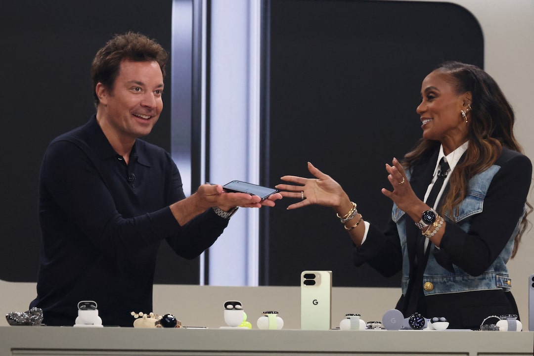 6項中的第1項 主持人吉米·法倫與谷歌全球產品營銷、品牌戰略及整合市場推廣副總裁Adrienne Lofton,在美國紐約布魯克林舉行的"Made by Google"活動上展示Pixel 10 Pro手機,該活動旨在介紹谷歌Pixel設備的最新成員,2025年8月20日。路透社/Brendan McDermid