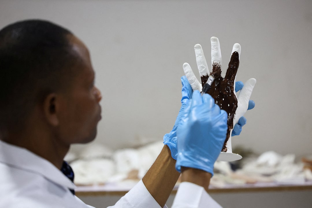 6項中的第1項 28歲的烏博科邦·阿馬南失去了一條肢體,他嘗試用一隻肉色仿生手臂握手,這隻手臂是他與36歲的兄弟約翰·阿馬南共同創造的。約翰曾是一名電影特效藝術家,現在在尼日利亞阿誇伊博姆州烏約的Immortal Cosmetic Art實驗室製作與膚色匹配的定製假肢。2025年8月15日。路透社/Sodiq Adelakun