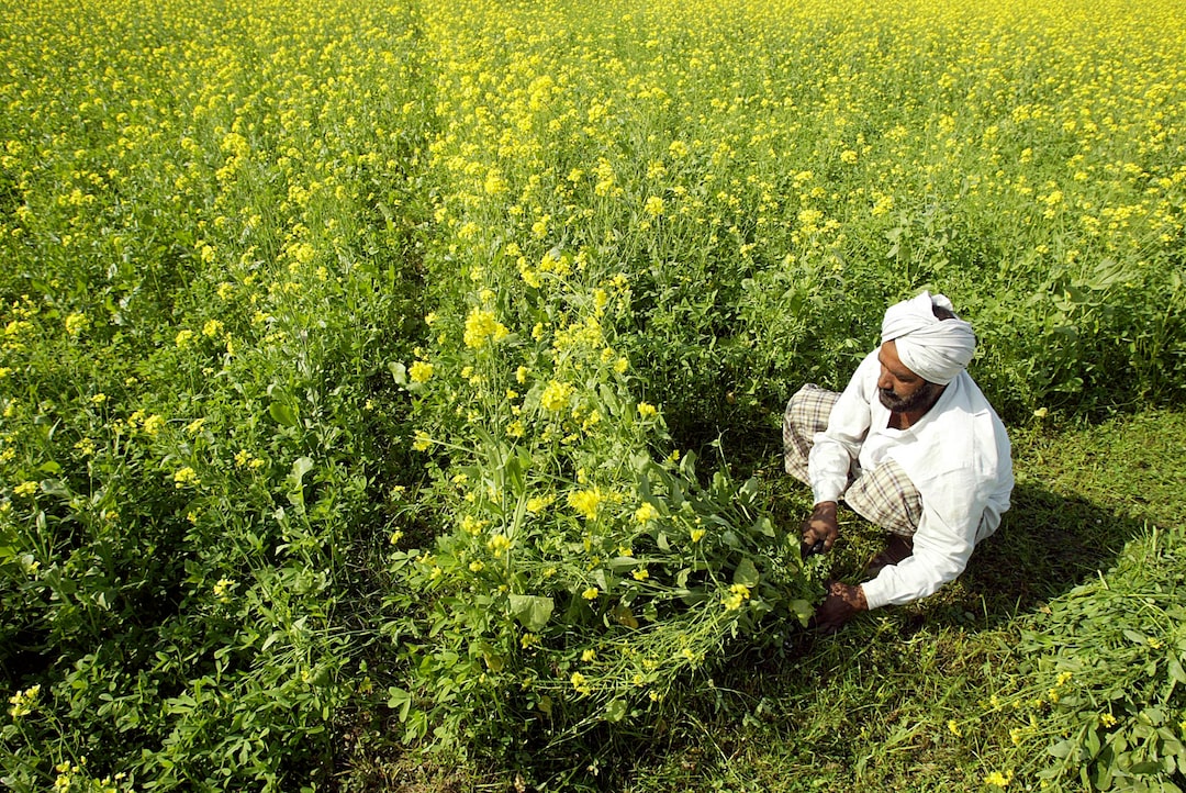 圖1/2 2008年11月25日,印度北部城市阿姆利則郊外,一名農民在油菜田中勞作。路透社/Munish Sharma/檔案照片