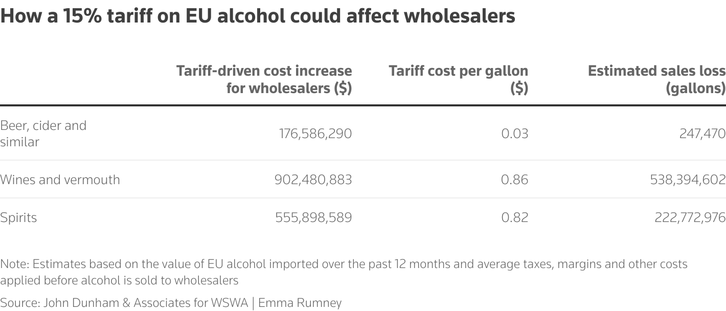 一張表格顯示了歐盟酒精飲料關税對批發商可能造成的成本,包括每加侖的估計平均關税成本以及啤酒、葡萄酒和烈酒的估計銷售損失,其中葡萄酒受影響最大。