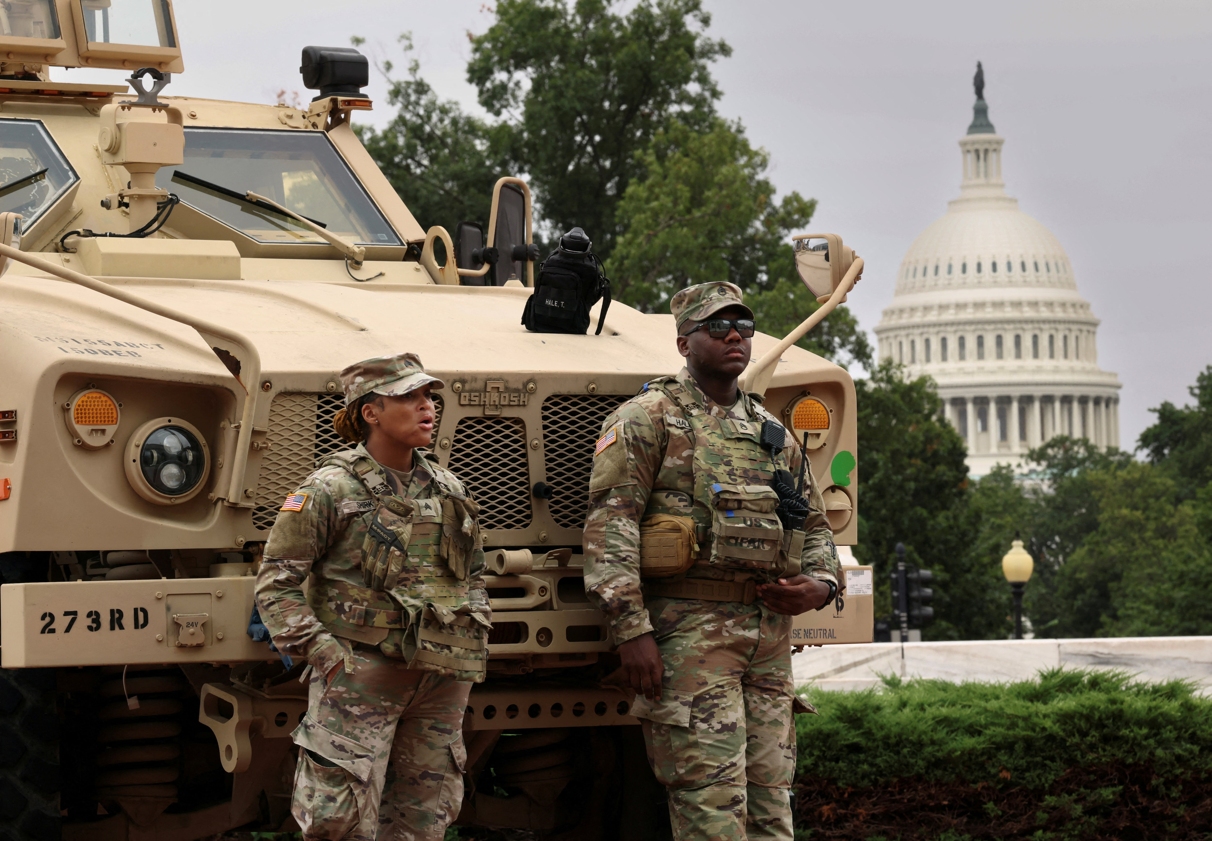 2025年8月19日,美國華盛頓特區,在美國總統唐納德·特朗普部署國民警衞隊並下令增加聯邦執法力量以協助預防犯罪後,DC國民警衞隊成員在聯合車站外警戒,背景可見美國國會大廈圓頂。路透社/凱文…購買授權許可,打開新標籤頁閲讀更多華盛頓,8月21日(路透社)- 美國總統唐納德·特朗普表示,他將在週四晚上與警察和軍隊一起巡邏華盛頓特區的街道,此前他已於上週在首都部署了國民警衞隊。