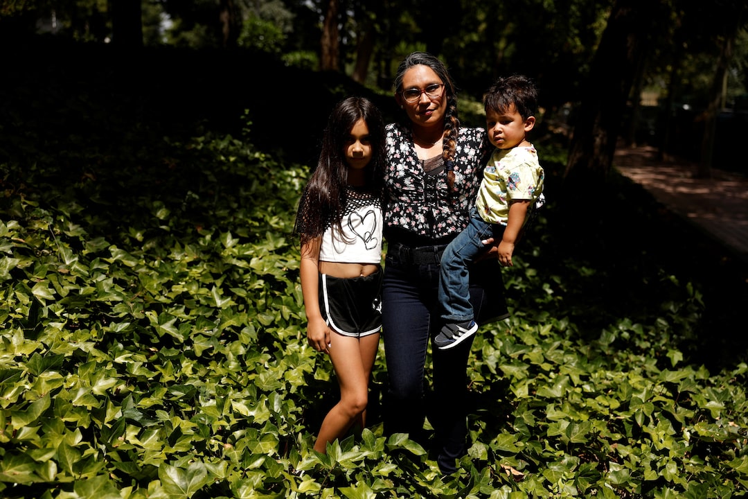 圖集1/2:2025年8月8日,41歲的梅利亞娜·布魯格拉在西班牙馬德里郊外的阿爾科孔接受路透社採訪前,與9歲的女兒維多利亞和2歲的兒子魯裏克合影。路透社/蘇珊娜·維拉
