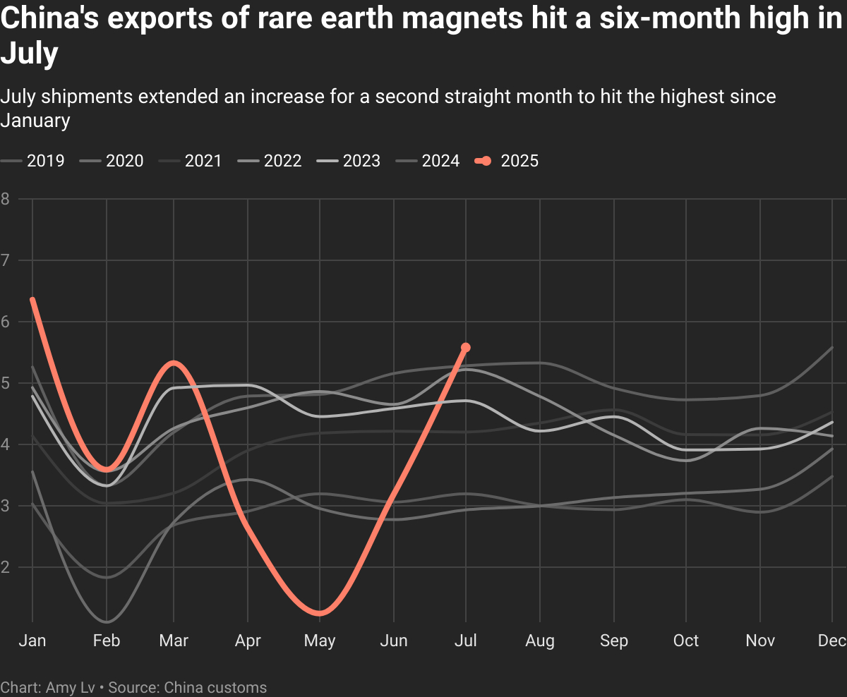 廣告·繼續滾動這一增長與中國稀土磁體出口的復甦同時發生,稀土磁體對電動汽車、風力渦輪機和國防領域至關重要。中國對美國稀土磁體的出口環比增長75.5%,達到619噸,比2024年同期增長4.8%,海關數據顯示。