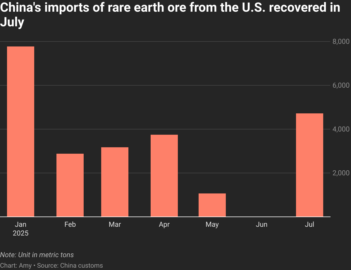 顯示2025年1月至7月中國從美國進口稀土礦石的變化