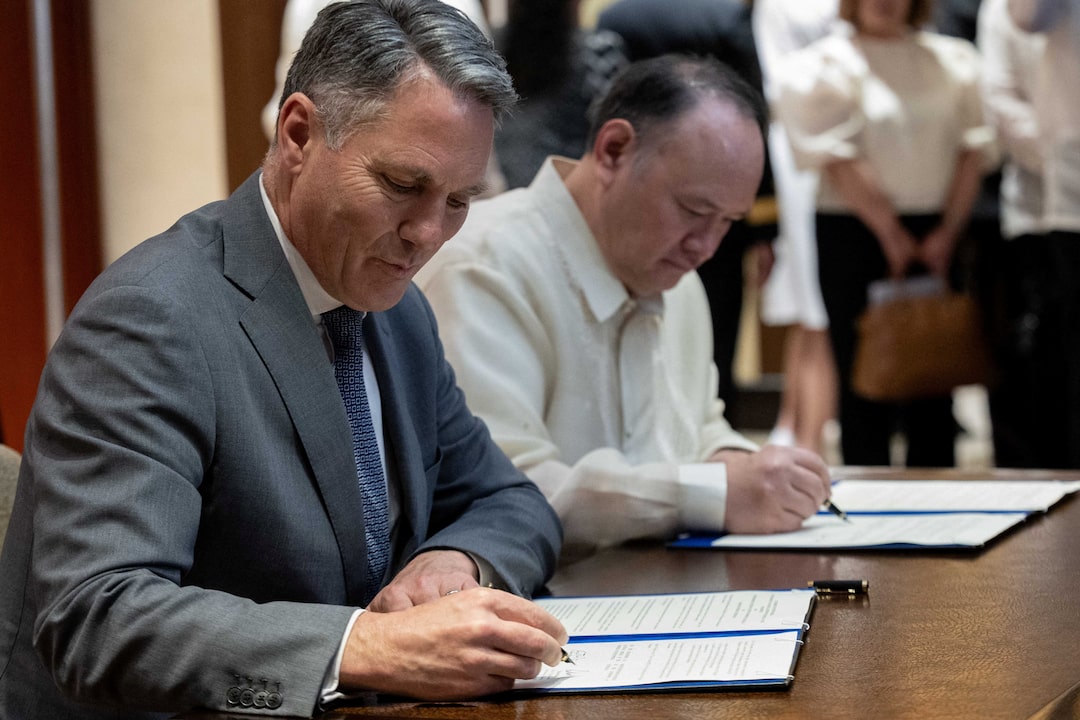 2025年8月22日,在菲律賓馬尼拉大都會馬卡蒂市,澳大利亞國防部長理查德·馬爾斯與菲律賓國防部長吉爾伯託·特奧多羅簽署加強防務合作意向聲明。路透社/埃洛伊薩·洛佩茲