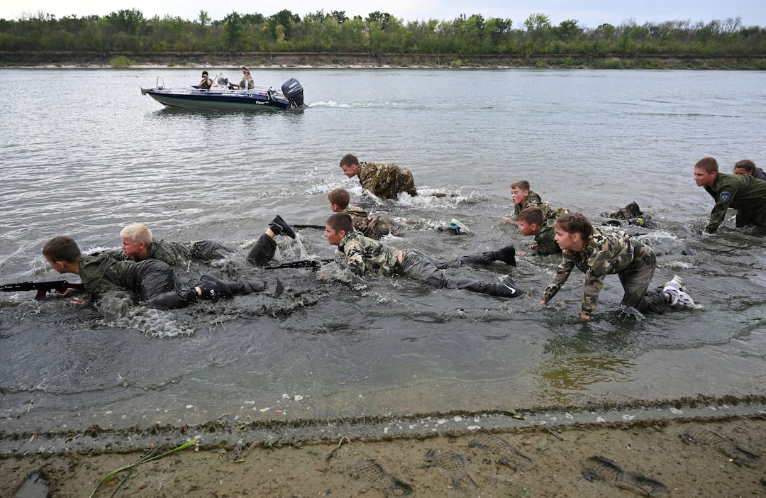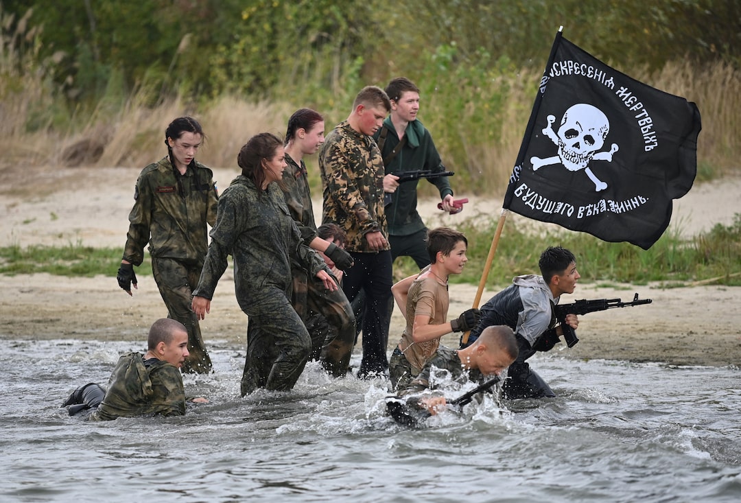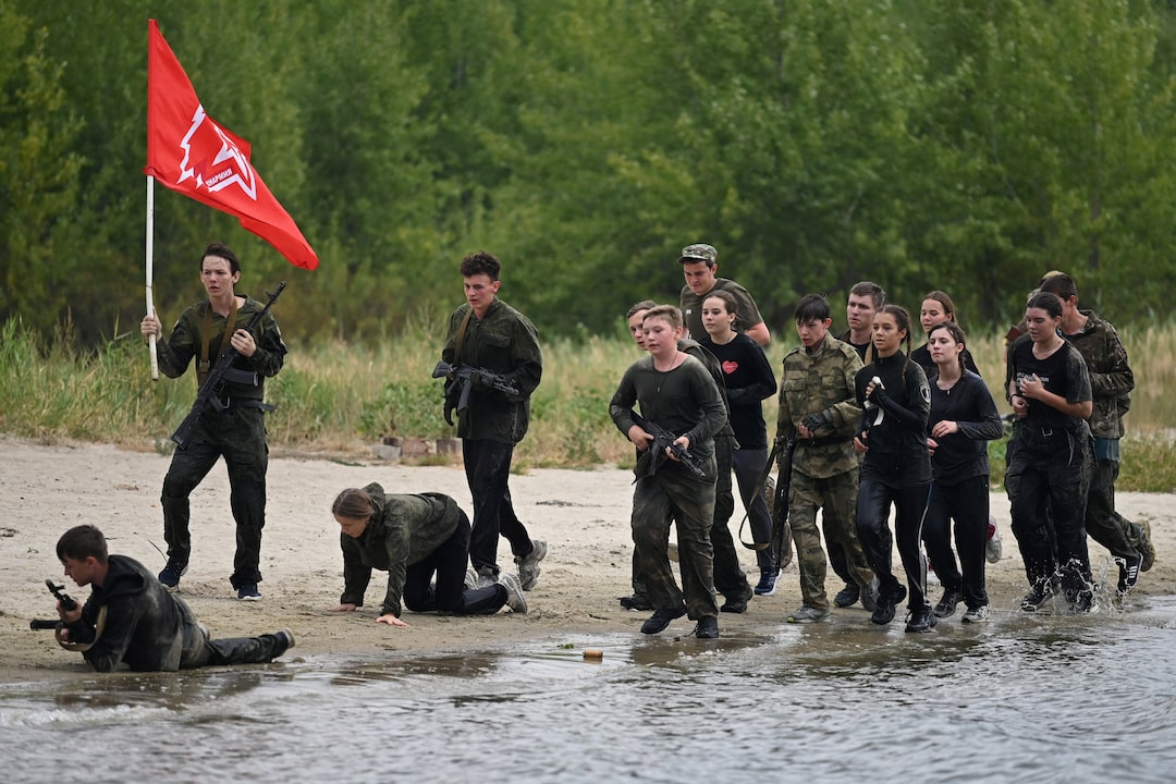 在軍事教官的吶喊激勵下,83名8至17歲的孩子沿着頓河岸進行"行軍拉練",交替在沙灘和淺水中匍匐前進。