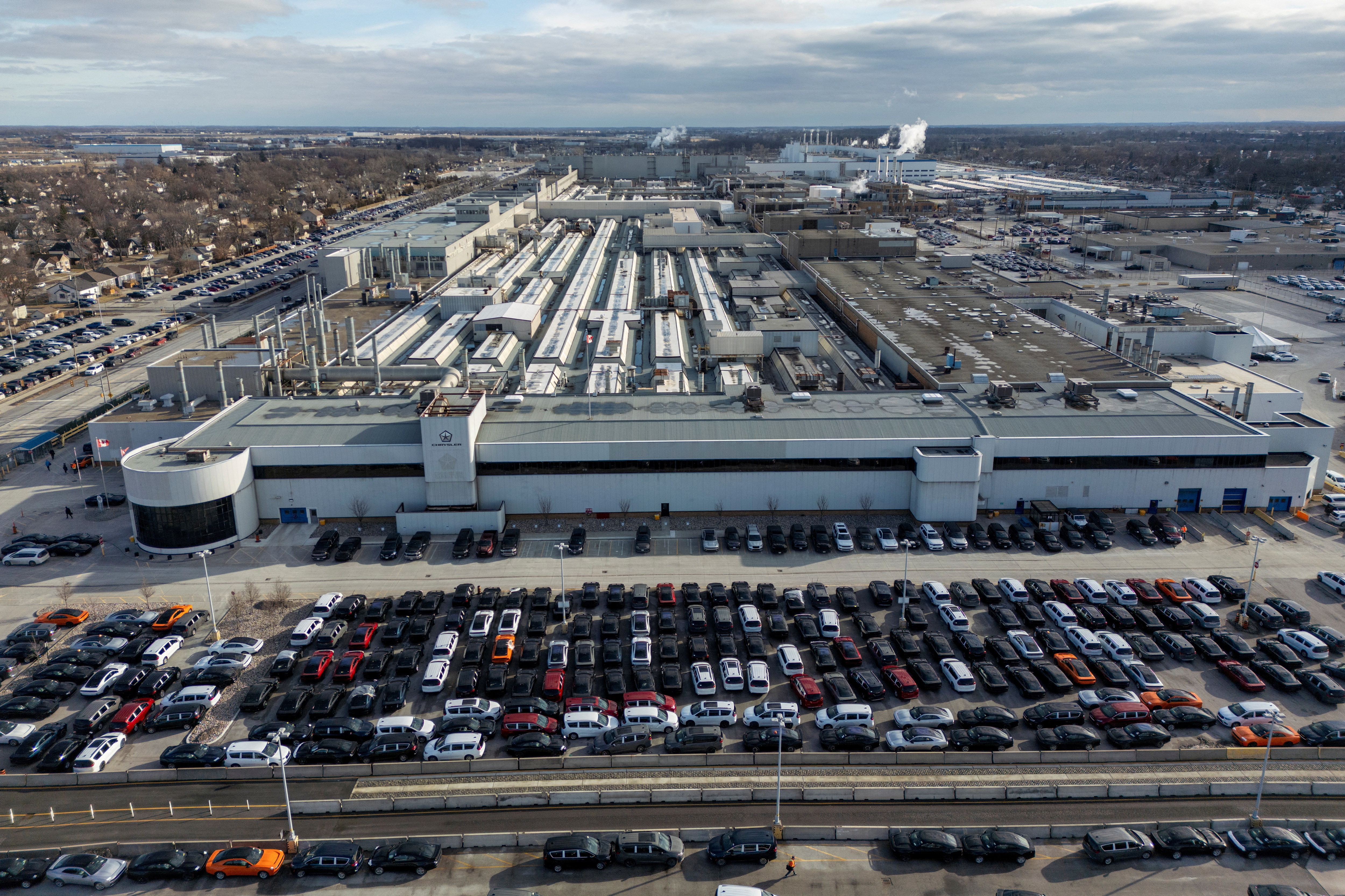 2025年2月4日,加拿大安大略省温莎市,斯特蘭蒂斯集團克萊斯勒温莎裝配廠的無人機航拍圖。路透社/卡洛斯·奧索里奧/檔案照片購買授權許可,打開新標籤頁渥太華,8月22日(路透社)——據知情人士透露,加拿大將於週五宣佈取消對美國商品的許多報復性關税,作為重啓停滯貿易談判的善意姿態。