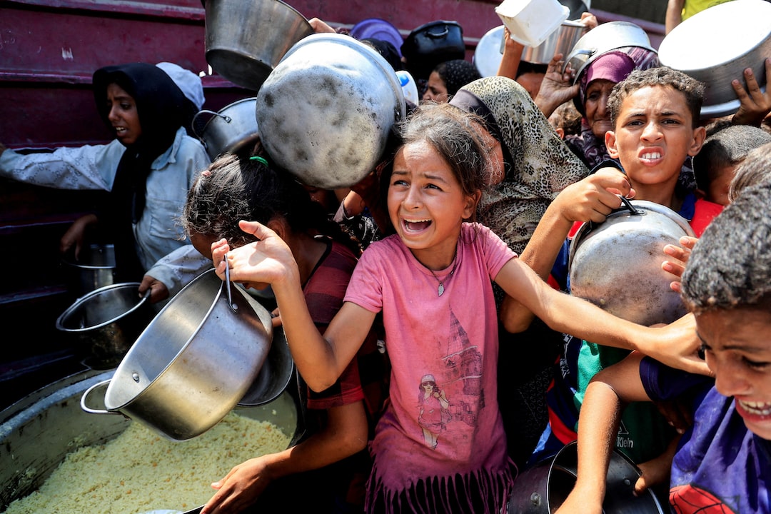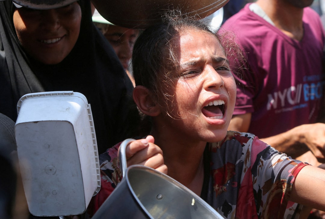 2025年8月21日,加沙地帶南部汗尤尼斯,巴勒斯坦民眾在慈善廚房外等待領取食物時,一名兒童被鍋具包圍着做出表情。路透社/Hatem Khaled 購買授權許可,打開新標籤頁以色列控制着進入加沙的所有通道。負責監督援助物資流動的以色列軍方機構COGAT表示,IPC報告無視以色列提供的援助交付數據,是國際社會詆譭以色列行動的一部分。