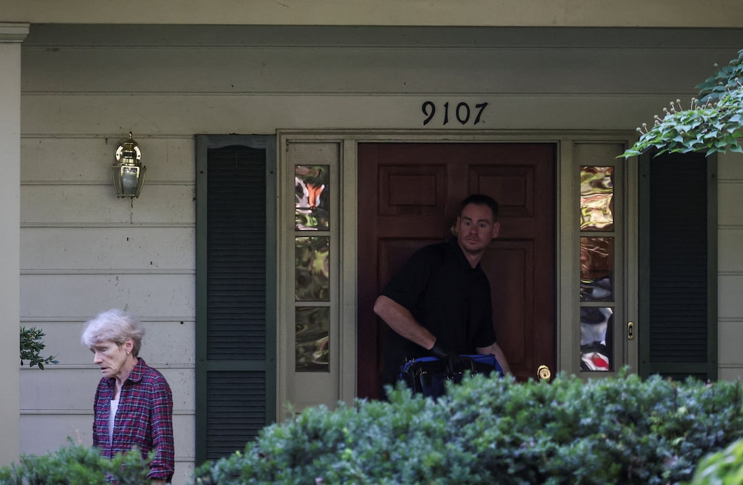 圖1/5 2025年8月22日,美國馬里蘭州貝塞斯達,FBI人員搜查前白宮國家安全顧問約翰·博爾頓的住所時,警察站在屋外。路透社/Tasos Katopodis