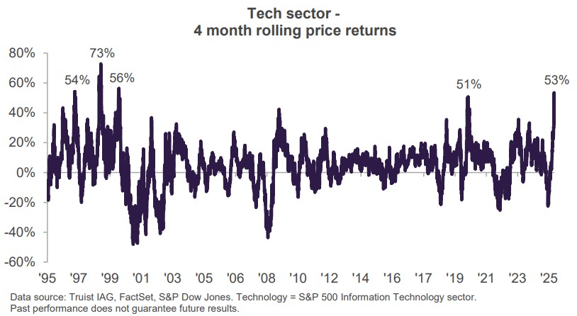 我們可能已經在最近科技股的回落中開始看到這一點。Truist投資顧問公司的聯席首席投資官基思·勒納最近指出,在截至8月中旬高點的四個月裏,美國科技股上漲了53%,這是自2000年3月以來可比時期內的最強表現。